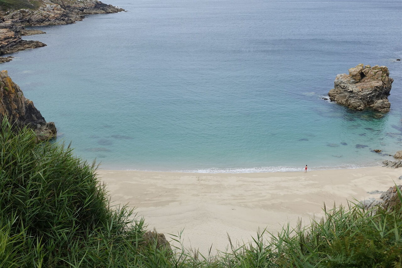 Auf dem Zöllnerpfad geht es weiter Richtung Osten. Mehrere Bachläufe werden überquert, bevor wir die traumhaft versteckte Bucht am 04 Plage de Trénaouret (32 m) entdecken, sie liegt kurz vor der nachfolgenden Landzunge Pointe de Trénaouret. Hinter den Überresten von Steinmauern haben wir eine weitere Landzunge umlaufen und blicken nun in das weite Rund einer Bucht, auch einen goldgelb strahlenden Sandstrand können wir ausmachen. Nach einem kurzen Abstieg zu einer Slipanlage erfolgt ein Aufstieg und wir gehen an dem links unterhalb liegenden Plage de Pors-Kiol vorbei.
