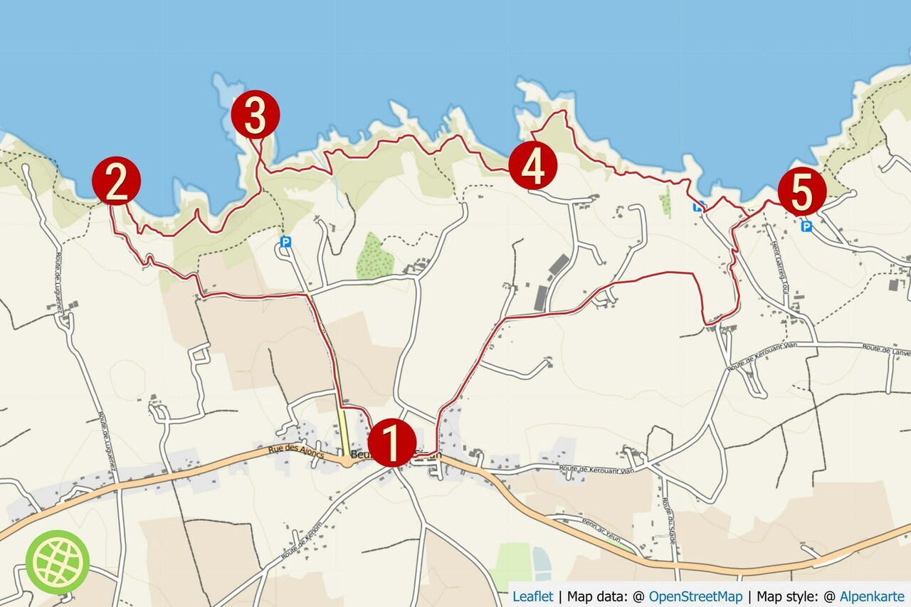 Vom Parkplatz gehen wir direkt links neben der Kirche 01 Église Notre-Dame de la Clarté et Saint-Budoc (93 m) durch die Gasse und auf der weiterführenden Straße an den Einzelhäusern vorbei. Am Ende der Straße laufen wir rechts und nach 570 m, bei der Kreuzung verlassen wir die Hauptstraße nach links, auch ausgeschildert Richtung Pellay. Die Straße schlängelt sich durch Häuser, dahinter haben wir freien Blick auf das Meer.