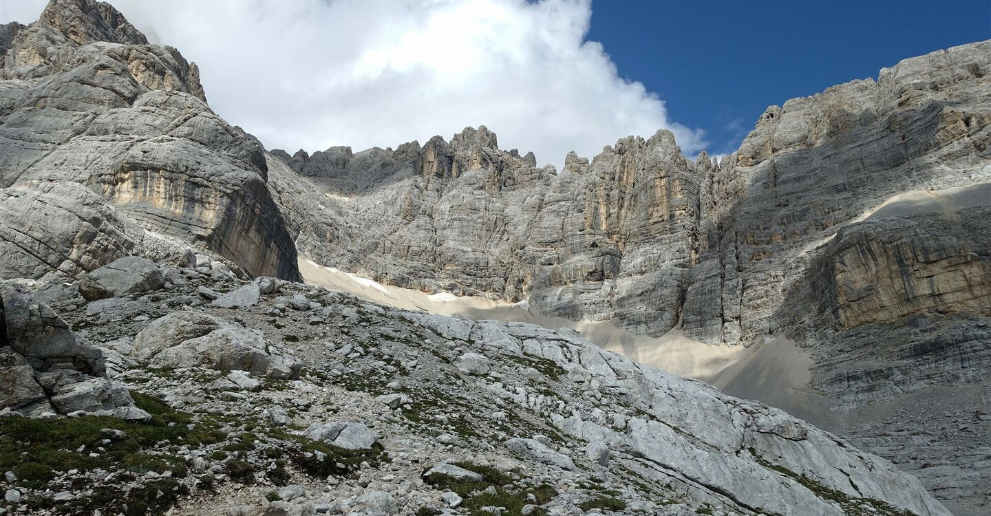 Vom 01 Bivacco Slataper (2.600 m) folgen wir dem bergab führenden Wanderweg 246. Er führt ein kurzes Stück in östlicher Richtung in das riesige Kar zwischen dem 3.002 m hohen Monte della Caccia Grande und dem 3.005 m hohen Punte Tre Sorelle.