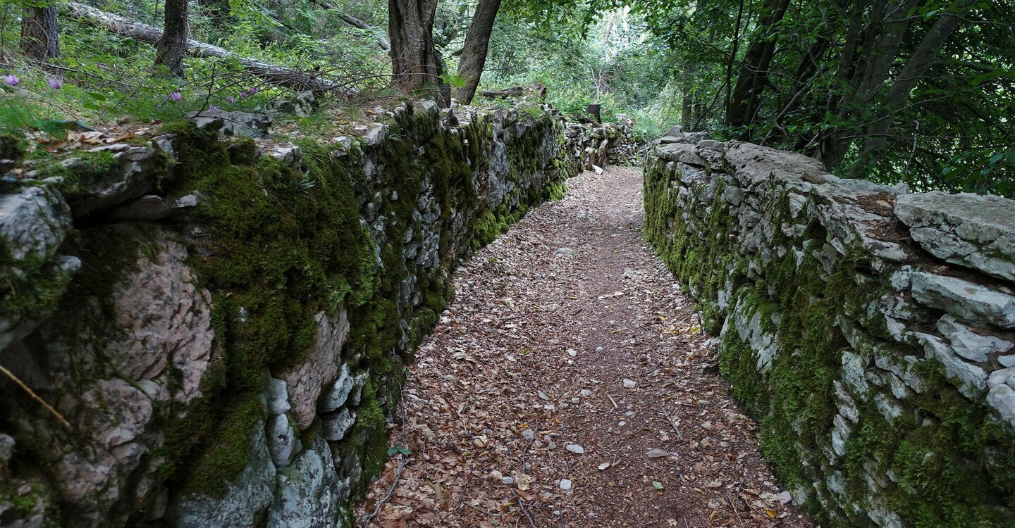 Nachdem wir die steilen und grasbewachsenen Berghänge hinter uns gelassen haben, gelangen wir in den 03 Bosco (Wald) (1.417 m). Im Wechsel zwischen grasbewachsenen Lichtungen und weiteren Waldstücken gehen wir nun kontinuierlich bergab, bis wir dann an einem Kreuz, einer Bank und einem Heiligenschrein vorbeikommen. Ca. 30 m hinter dem Heiligenschrein gehen wir rechts weiter, nun auf einem mit Steinen gesäumten Pfad – weiterhin der Wanderweg 482.