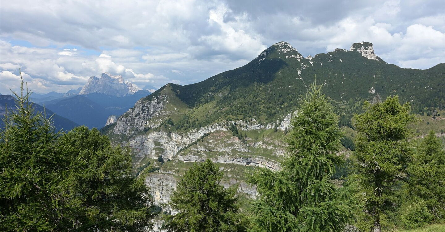 Wir erreichen den baumlosen 02 Passo Dou (1.840 m), Richtung Norden erhebt sich der mächtige Monte Pelmo und links davon die Civetta. An der Gabelung der beiden Pfade gehen wir nicht halb links auf einem Höhenweg weiter, sondern halb rechts, von nun an geht es kontinuierlich bergab. Rechts unterhalb befindet sich das weitläufige Zoldotal. Wir ignorieren einen rechten Abzweiger und hinter einem großen Steinhaufen einen nach links abzweigenden Pfad.