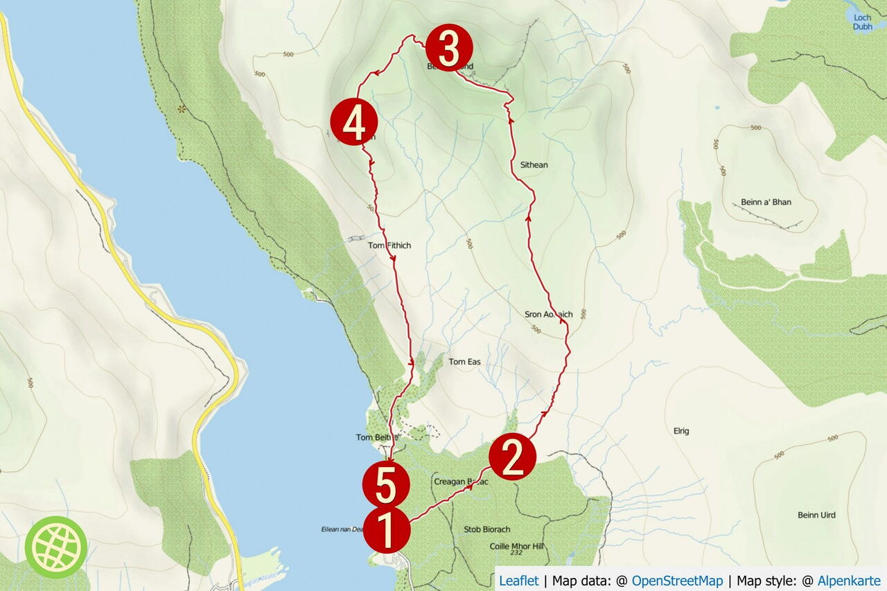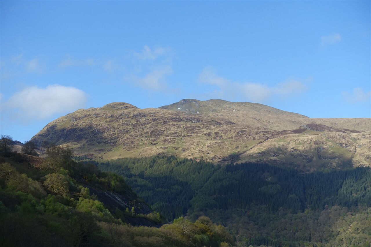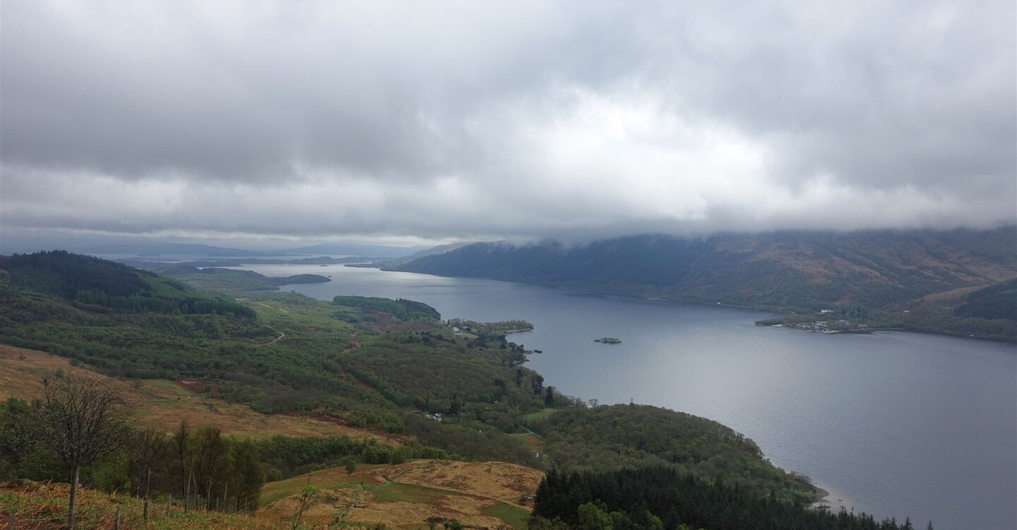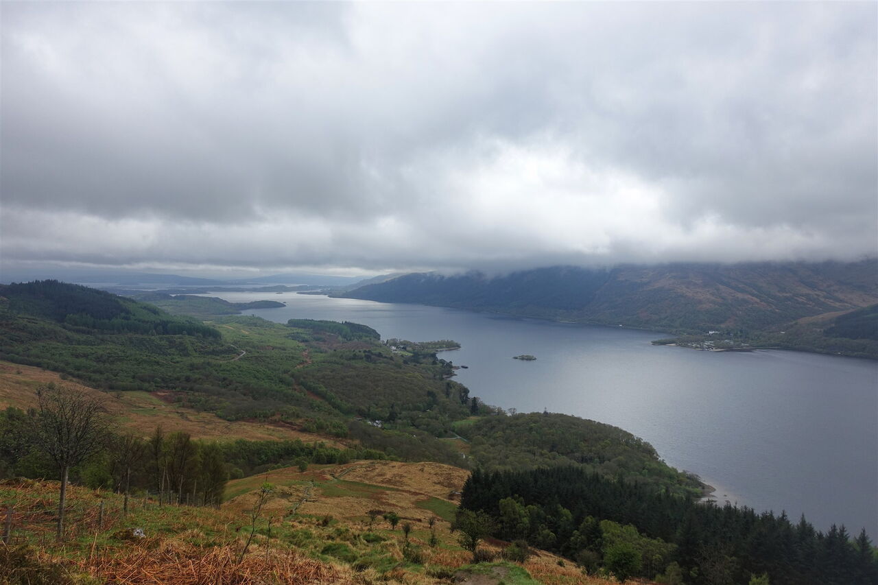 Zunächst geht es durch einen Eichenwald, dann passieren wir ein 02 Gatter (194 m) und kurz später queren wir eine Forststraße. Schon bald lassen wir die Bäume hinter uns, der Blick ist frei in Richtung des Ben Lomond. Wir passieren im Folgenden ein weiteres Gatter. Noch in den Neunzigerjahren war der nachfolgende Aufstieg bis zu 25 m breit und die Oberfläche stark erodiert. Dann legte der National Trust den heutigen ausgezeichneten Weg an, der nur noch ein paar Meter breit ist, sodass die Natur sich erholen konnte. Stand 2018 betreute der National Trust 46 Wanderwege in Schottland. Nach 3,35 km erreichen wir einen schönen Aussichtspunkt, den kleinen Gipfel des Sron Aonaich (577 m).