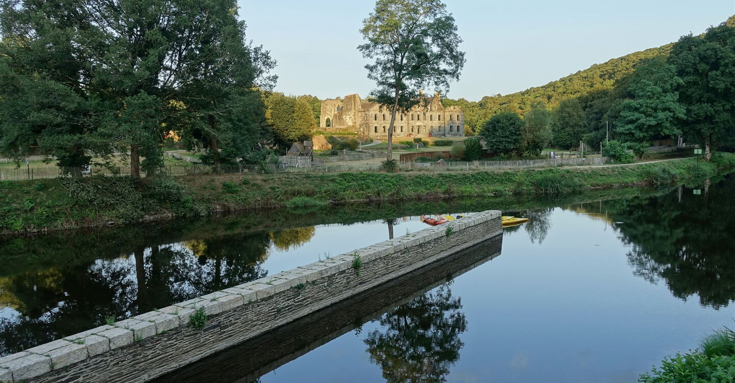 Wir gehen rechts an der Straße entlang und dort, wo von rechts ein Pfad in die Straße mündet, gehen wir links in den Wald. Der Pfad mündet kurz später in einen breiten Weg, der mit moosbedeckten Steinen gesäumt ist. Kurz später wird der Weg wieder zum Pfad und führt an einer Lichtung vorbei. Hinter einem Mauerdurchbruch gehen wir rechts weiter, entlang dieser moosbedeckten Mauer. An einigen Stellen ist die Wegführung nicht eindeutig, man kann sich aber an den Überresten der moosbedeckten Mauer orientieren. Zwischenzeitlich wird der Pfad wieder zum Weg. Bei einer Weggabelung, wo sich mittig ein Baum befindet, halten wir uns halb links. Von links mündet ein weiterer Pfad in unseren Weg, wir vernehmen Autogeräusche und erreichen die Schleuse 05 Ecluse de Bon Repos (126 m). Es ergibt sich ein malerisches Bild mit den dahinter liegenden Ruinen der Abtei, besonders in den Abendstunden.