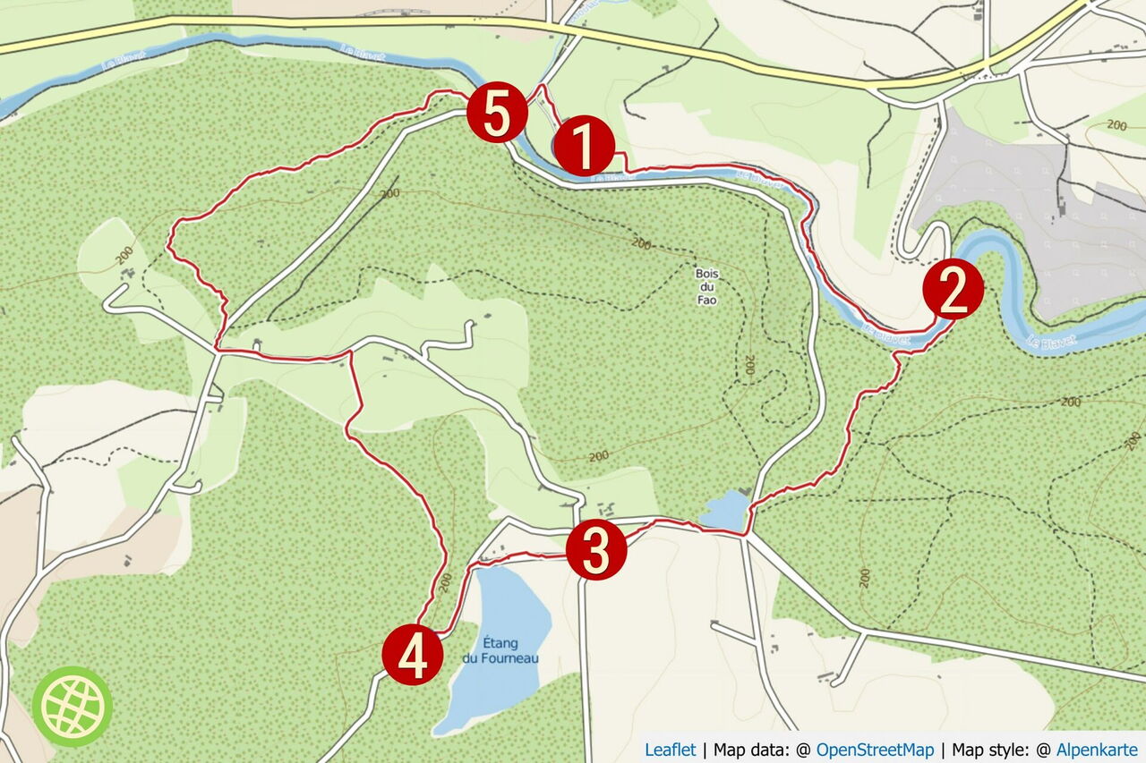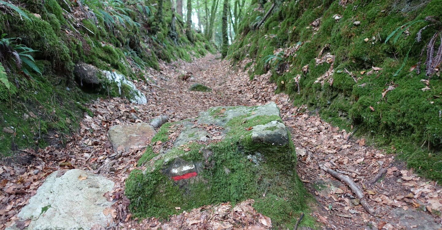 Auf einer Anhöhe zweigen zwei Wege nach rechts ab. Wir nehmen den halb rechten Weg und gehen nun durch den Wald 04 Bois Du Fao (199 m). Nachfolgend befinden sich weiße Markierungspfeile an den Bäumen, die eine gute Orientierungshilfe sind. An einer Wegekreuzung gehen wir geradeaus weiter, mehrere rechte und linke Abzweiger vom Hauptweg ignorieren wir. Bei einer Weggabelung verlassen wir dann den Wald nach halb rechts. Anschließend gehen wir auf einem schwer zu erkennenden Weg über eine Wiese. Orientierungshilfe: Wir gehen unter einer Stromleitung hindurch in Richtung eines erhöht liegenden Hauses. Dort befindet sich eine Straße, auf der wir links bis zu einer Straßenkreuzung mit einem Steinkreuz gehen.