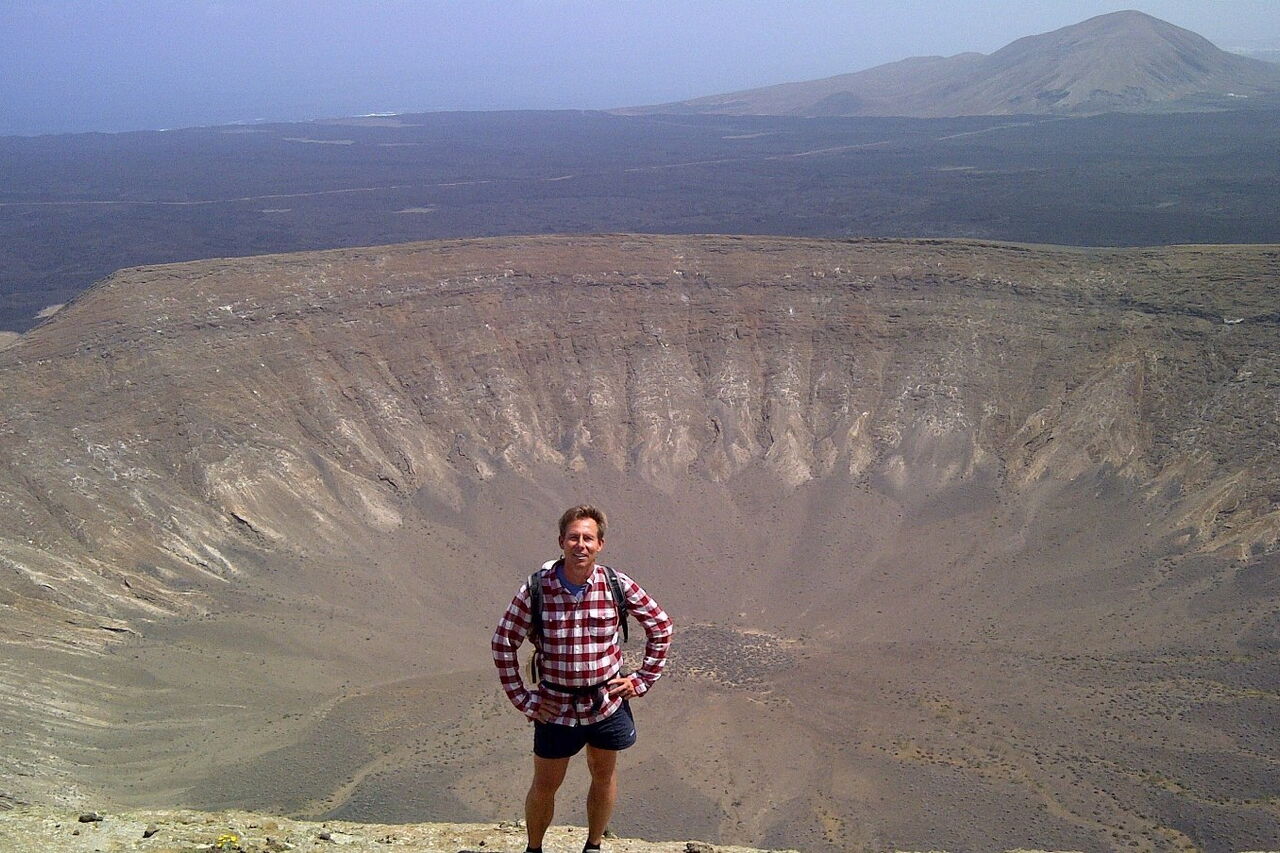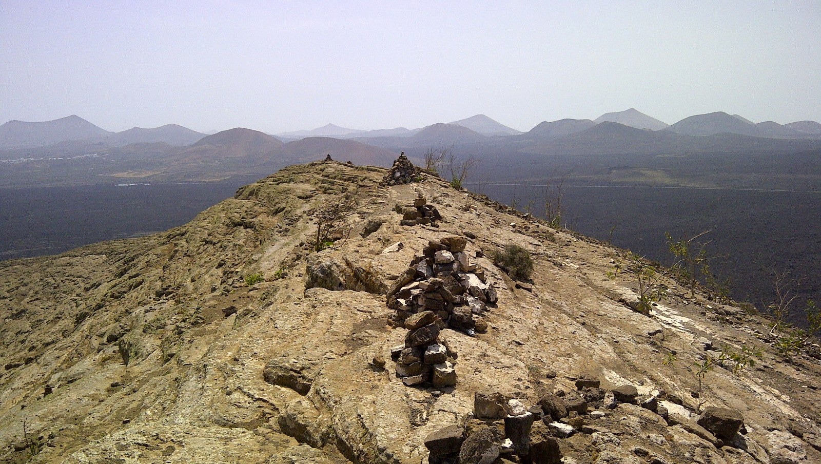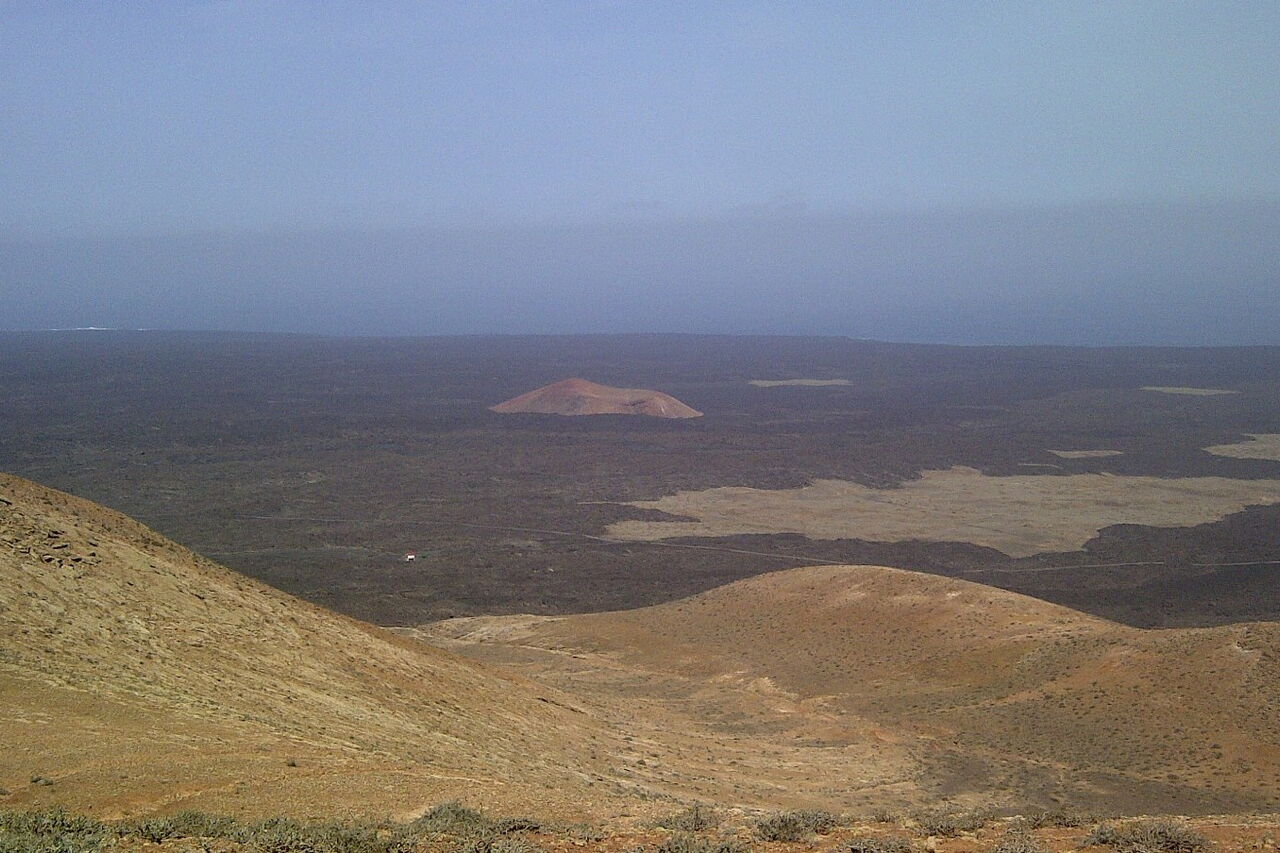 Von hier aus beginnen wir die Rundwanderung auf dem Krater gegen den Uhrzeigersinn. Schnell gewinnen wir an Höhe, bis wir schlussendlich den Gipfel der (03) Caldera Blanca (458 m) erreicht haben. Vom Gipfel aus ergibt sich eine grandiose Aussicht auf die Lavaströme, die es bis zur Nordküste geschafft haben. Richtung Osten erkennen wir den Ort Mancha Blanca und in der Ferne das Risco-de-Famara-Gebirgsmassiv sowie in südlicher und westlicher Richtung die vielen Vulkankegel des Timanfaya-Nationalparks.