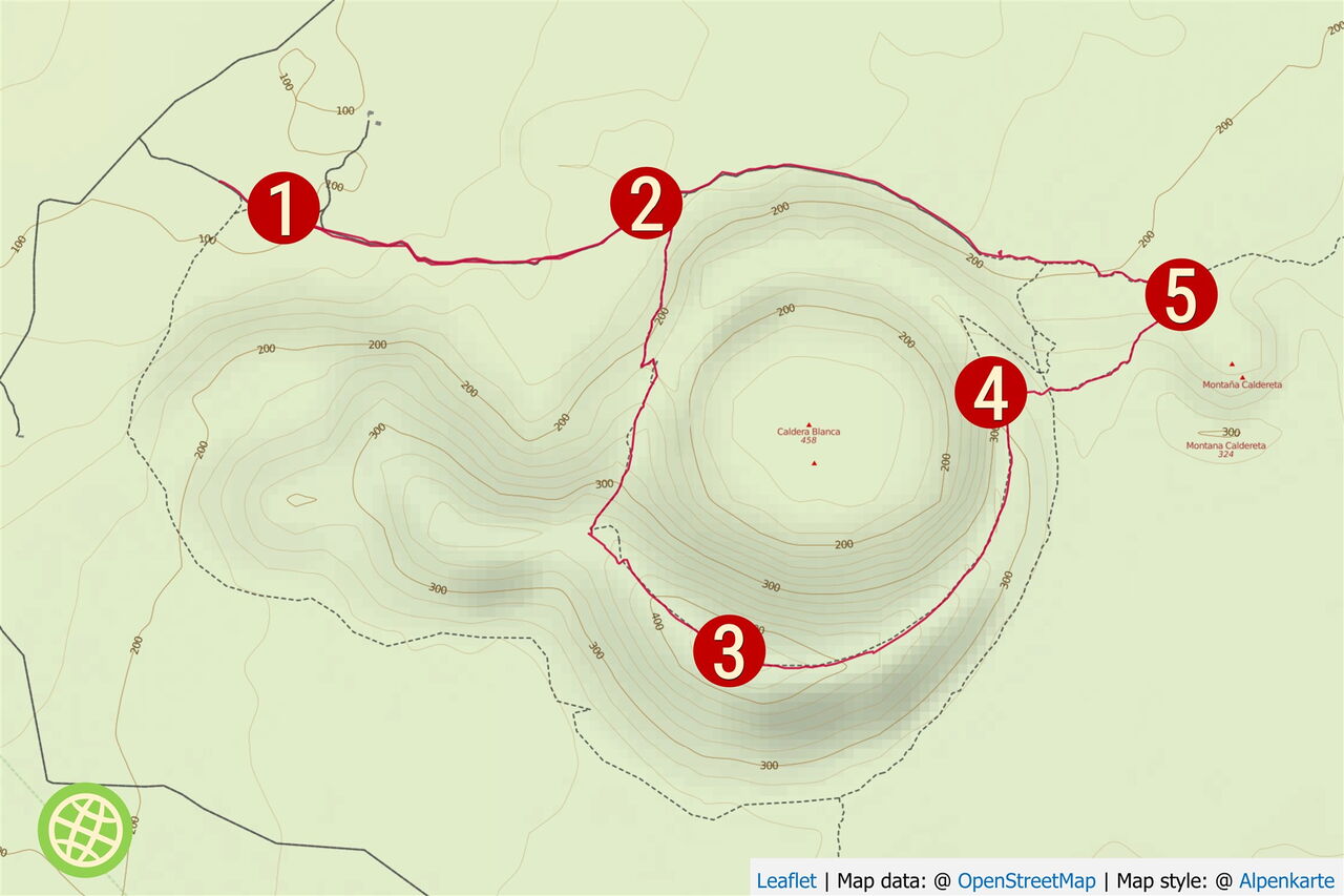 Weiterhin gegen den Uhrzeigersinn gehen wir nun weitere 1,3 km auf dem Krater, bis wir auf gleicher Höhe mit der rechts von uns liegenden Montaña Calderata angekommen sind. Hier führt rechts ein Pfad zum (04) Abstieg (311 m) durch die Ostflanke des Vulkans, herunter zu dem schwarzen Lavastrom. Am Fuße der Caldera Blanca gehen wir zunächst noch 50 m rechts, um dann links einen Pfad durch den Lavastrom zu nehmen. Bei den Neuzeitausbrüchen hatten sich die Lavaströme an dieser Stelle einen Abfluss zum Meer gebahnt, der entlang der Altvulkane Caldera Blanco und Montaña Caldereta verläuft.