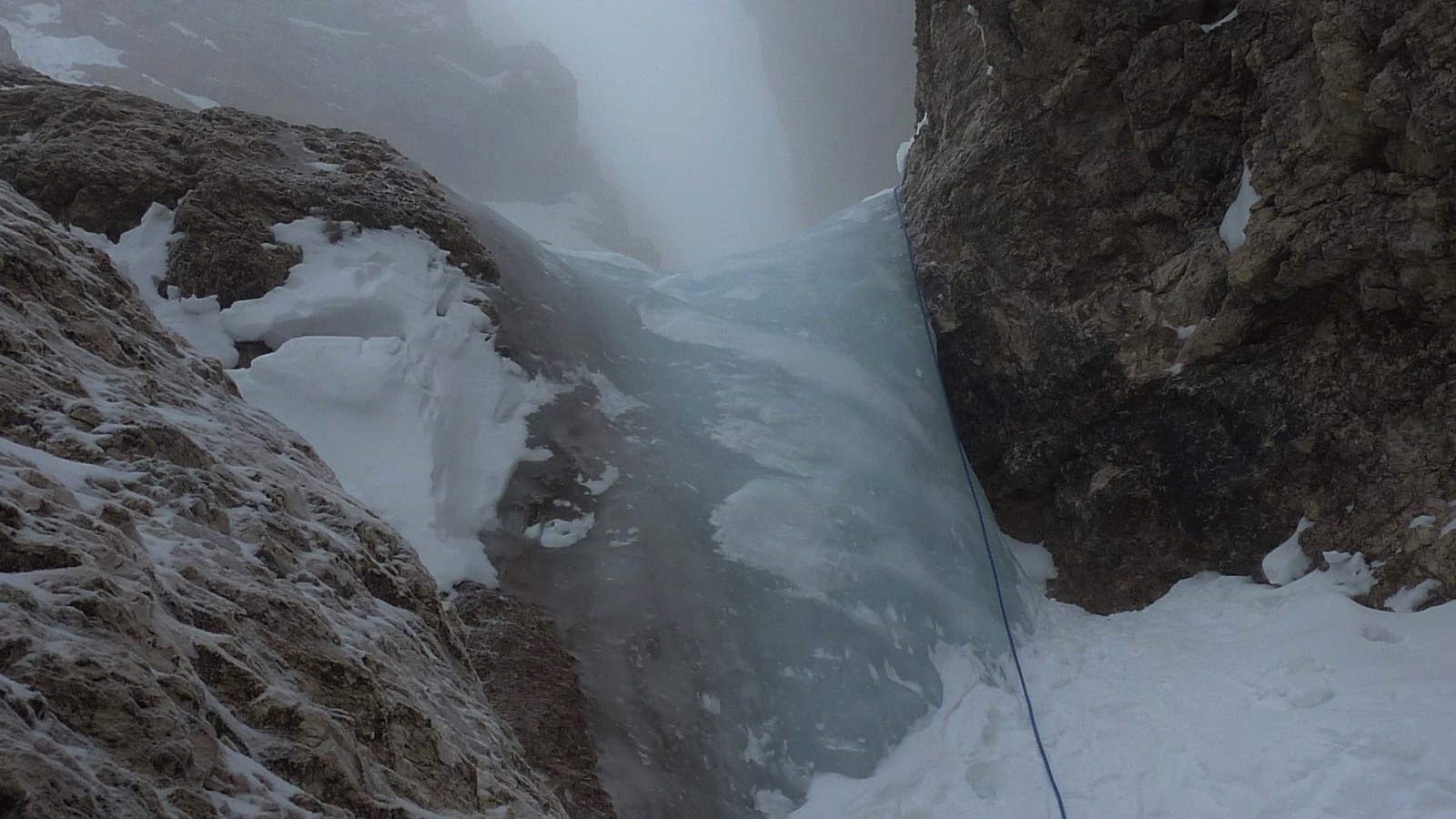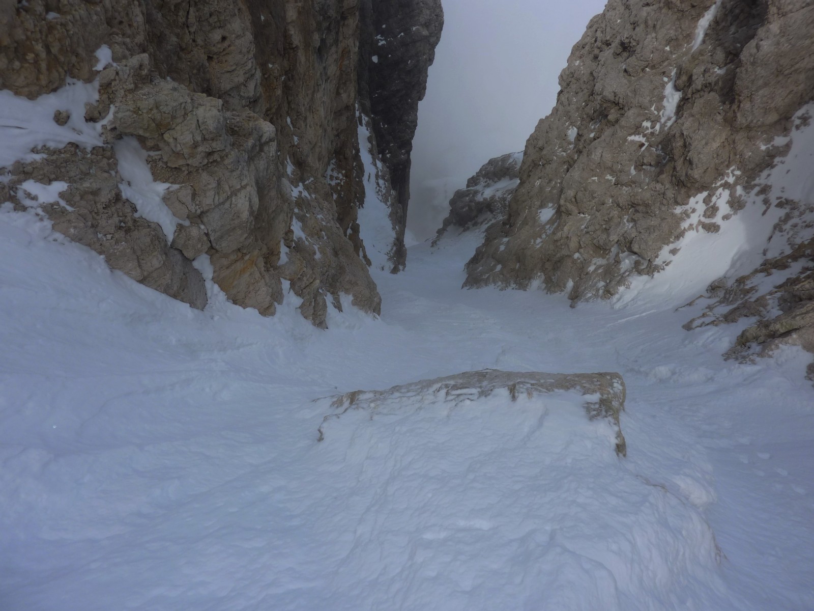 Mein GPS hat in der Scharte versagt. Aber einmal drin, gibt es keinen anderen Weg mehr als hinunter. Die Abfahrt führt über einen Nordhang. Folgende Ausrüstung wird empfohlen: Produkte für alpine Sicherheit im Schnee, Freerideski, Klettergurt mit 20m Kletterseil, Steigeisen und Pickel und Skitourenhelm. Es empfiehlt sich die Einkehr in das Rifugio Maria bei der Bergstation, welches nach Maria Piaz, der Pionierin des Tourismus am Pordoipass, benannt wurde. Beste Jahreszeit: Januar bis April. Uns erwarten kurze Stücke mit bis zu 50° Hangneigung.