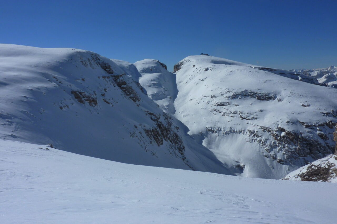 Wenn noch keiner die Strecke gefahren ist, ist die Orientierung ab den Latschenkiefern nicht so einfach. Die Abfahrt führt über einen Nordhang und Westhang. Folgende Ausrüstung wird empfohlen: Produkte für alpine Sicherheit im Schnee, Freerideski und Skitourenhelm. Es empfiehlt sich die Einkehr in das Rifugio Maria bei der Bergstation, welches nach Maria Piaz, der Pionierin des Tourismus am Pordoipass, benannt wurde. Beste Jahreszeit: Januar bis April. Uns erwarten kurze Stücke mit bis zu 35° Hangneigung.