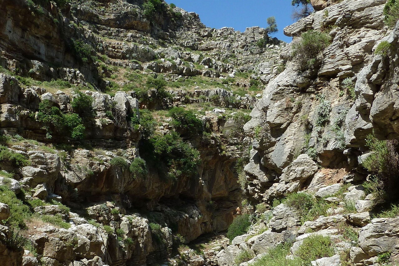 Das landschaftsprägende Attaviros-Gebirgsmassiv im mittleren Westen von Rhodos hat zwei mächtige Schluchtausläufe. Vom Hauptgipfel, dem Attaviros, endet der längste Schluchtauslauf, Richtung Osten, unterhalb des Dorfes Agios Isodoros. Richtung Westen, zwischen dem Attaviros-Hauptgipfel und dem Nebengipfel Voskotopi, schlängelt sich der Canyon Plouma Richtung Meer – unser heutiges Projekt. Aber diese Durchwanderung des Canyons, bei der man eigentlich mehr am Klettern als am Wandern ist, erfordert unsere vollste Aufmerksamkeit und ist sehr schweißtreibend. Auf der Wanderung erzählt die Natur die schönsten Geschichten: eine eindrucksvolle Schlucht mit bis zu 200 m senkrecht aufsteigenden Felswänden, den stufenförmig geschichteten Gesteinsschichten und einem nur 3 m engen Nadelöhr.