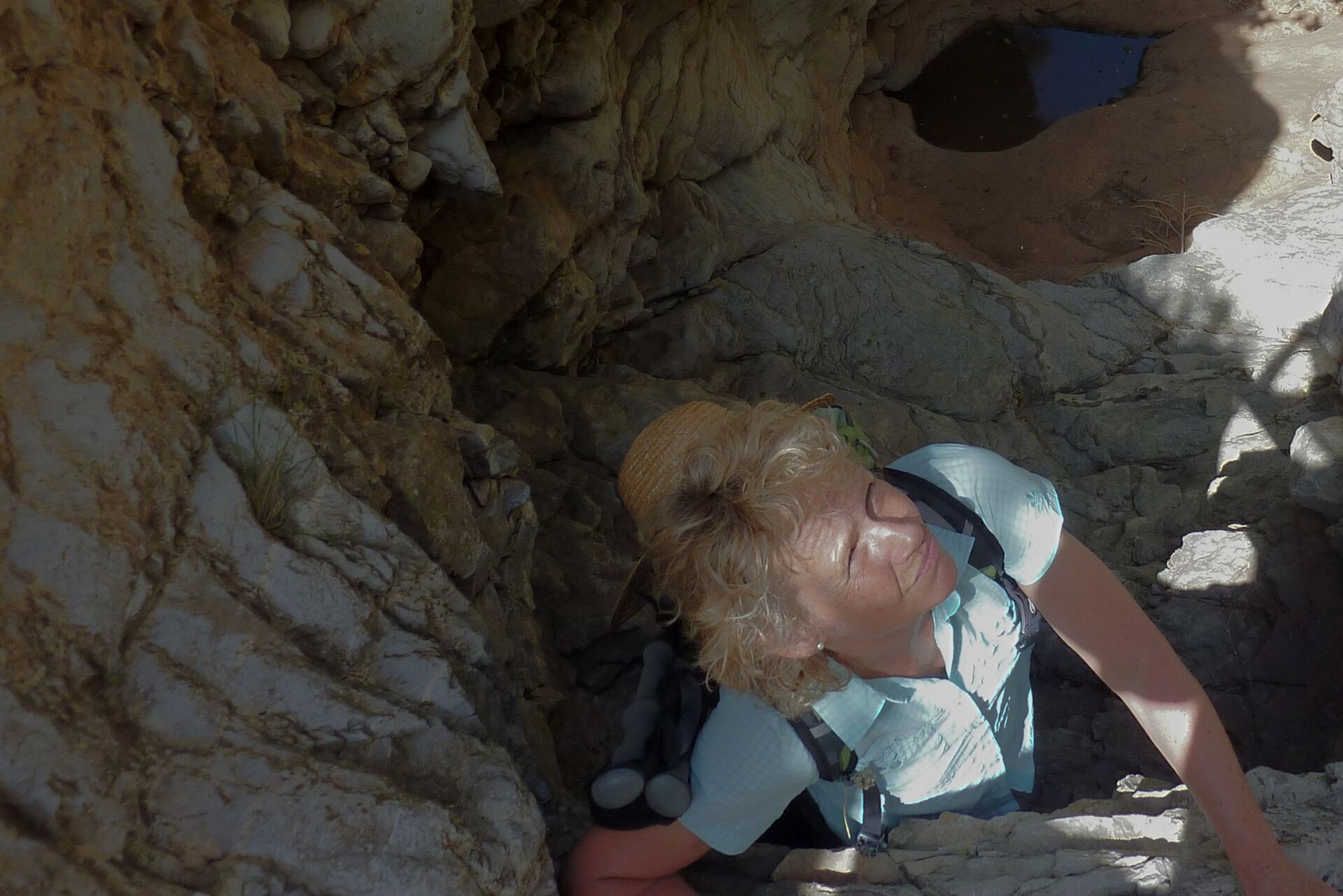 Immer wieder müssen unter Zuhilfenahme der Hände kleine (03) Stellen umlaufen (453 m) werden. Der Weg ist eindeutig vorgegeben, denn es gibt kein Entrinnen aus der tiefen Schlucht.