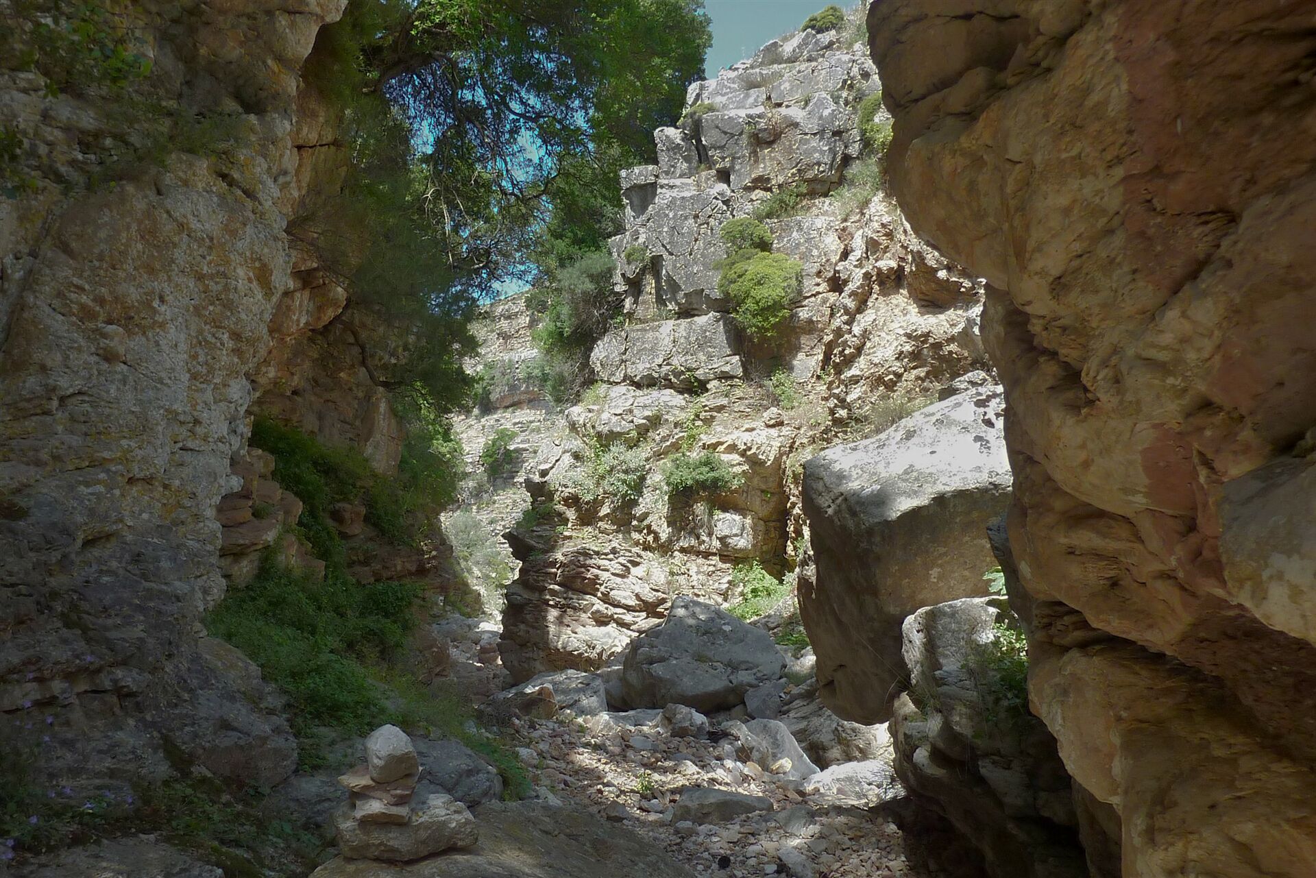 Der Canyon ist inzwischen zu einem zahmen Bachlauf geworden. Rechts führt der Bachlauf unterhalb der Felsen durch eine Rechtskehre, von links mündet ein kleinerer Bachlauf in den Hauptstrom. Hier befindet sich der (05) Ausstieg (508 m). Wir klettern zu dem links einmündenden Bachlauf hinauf und folgen wie Detektive seinem Lauf, der durch den dichten Kiefernwald führt. Inzwischen schwer auszumachen, gabelt sich der Bachlauf. Hier folgen wir ihm durch die Linkskurve, um dann nach nur 100 m rechts bergauf zu gehen und nach weiteren 150 m die Asphaltstraße zu erreichen. Auf dieser gehen wir links vor, bis wir freien Blick auf die Ägäis haben und die Straße eine Rechtskehre macht. Links von uns befindet sich ein Hang, den wir pfadlos heruntergehen. Büsche und Sträucher erschweren das Vorankommen, bis wir an einer 5-7 m hohen, unüberwindbaren Klippe oberhalb der Straße ankommen. Wir gehen links an dieser Klippe entlang. Im folgenden Waldstück gibt es eine Abstiegsmöglichkeit zur Straße. Auf der Straße gehen wir links bis zum geparkten Pkw zurück.