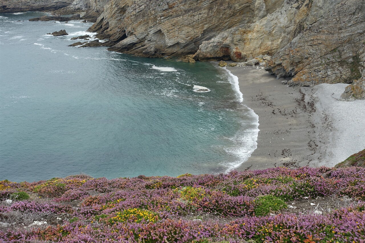 Auf einer spektakulären Streckenführung erkunden wir das Cap de la Chèvre, eine Landzunge am südlichen Ende der Halbinsel Crozon. Die Landschaft wechselt zwischen bis zu 100 m hohen Klippen, lichten Kiefernwäldern und blühenden Heideflächen, die von Ginster unterbrochen werden. Durch die sich ständig verändernden Wassertiefen und den wechselnden Meeresuntergrund aus Sand, Kieselsteinen und Fels ergeben sich besondere Farbnuancen im Atlantischen Ozean. Man spürt förmlich die Nähe des Golfstroms, in geschützten Buchten findet man eine mediterran anmutende Flora. Es ergeben sich wunderbare Ausblicke über die Baie de Douarnenez bis zur gegenüberliegenden Landzunge Sizun. Bunker als stumme Zeitzeugen der Kriegsgeschichte sowie ein beeindruckendes Denkmal für die Flieger der französischen Marine lassen uns innehalten. Ein Weg der Langsamkeit.