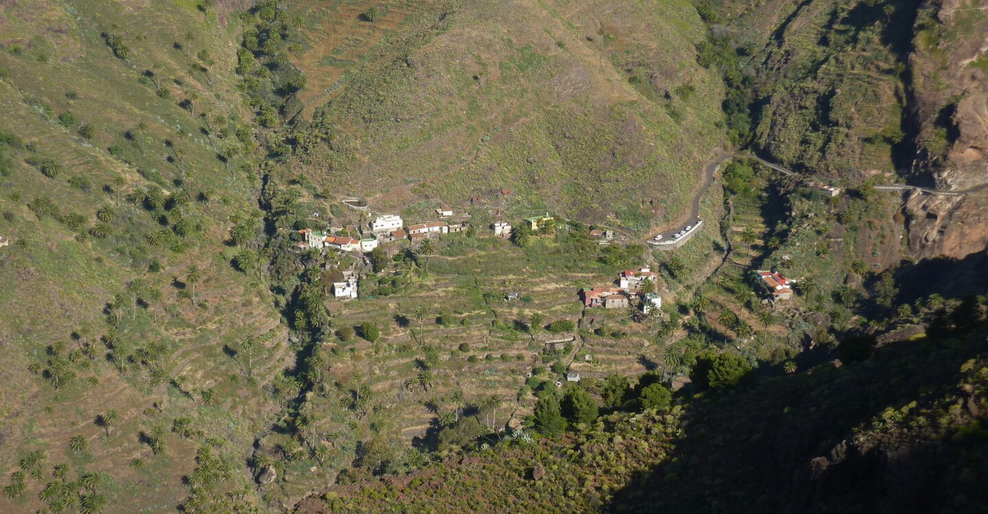 An einer Mauer endet der Weg und wir gehen rechts, vorbei an dem roten Haus, durch eine enge Gasse, bis wir links entlang eines Treppengeländers in den Ortskern gelangen. Der Weiler (03) Lo del Gato (461 m) wird von wenigen Menschen bewohnt und befindet sich unterhalb vom Benchijigua. Neben zahlreichen traditionellen Häusern gibt es auch einige Neubauten. Als wichtige Lebensgrundlage wird die Ansiedlung von einer Quelle mit Wasser versorgt. Für den weiteren Weg queren wir den Ort 100 m in südliche Richtung, bis wir links unterhalb von uns ein grünes Haus sehen. Hier verlassen wir den Weg mit dem Geländer, machen eine 90°-Kehre nach rechts und gehen in westliche Richtung weitere 160 m in das kleine Barranco hinein. Dabei passieren wir ein Wasserauffangbecken und laufen durch hohes Schilf, bis sich eine gute Möglichkeit ergibt, das Barranco nach links zu queren.