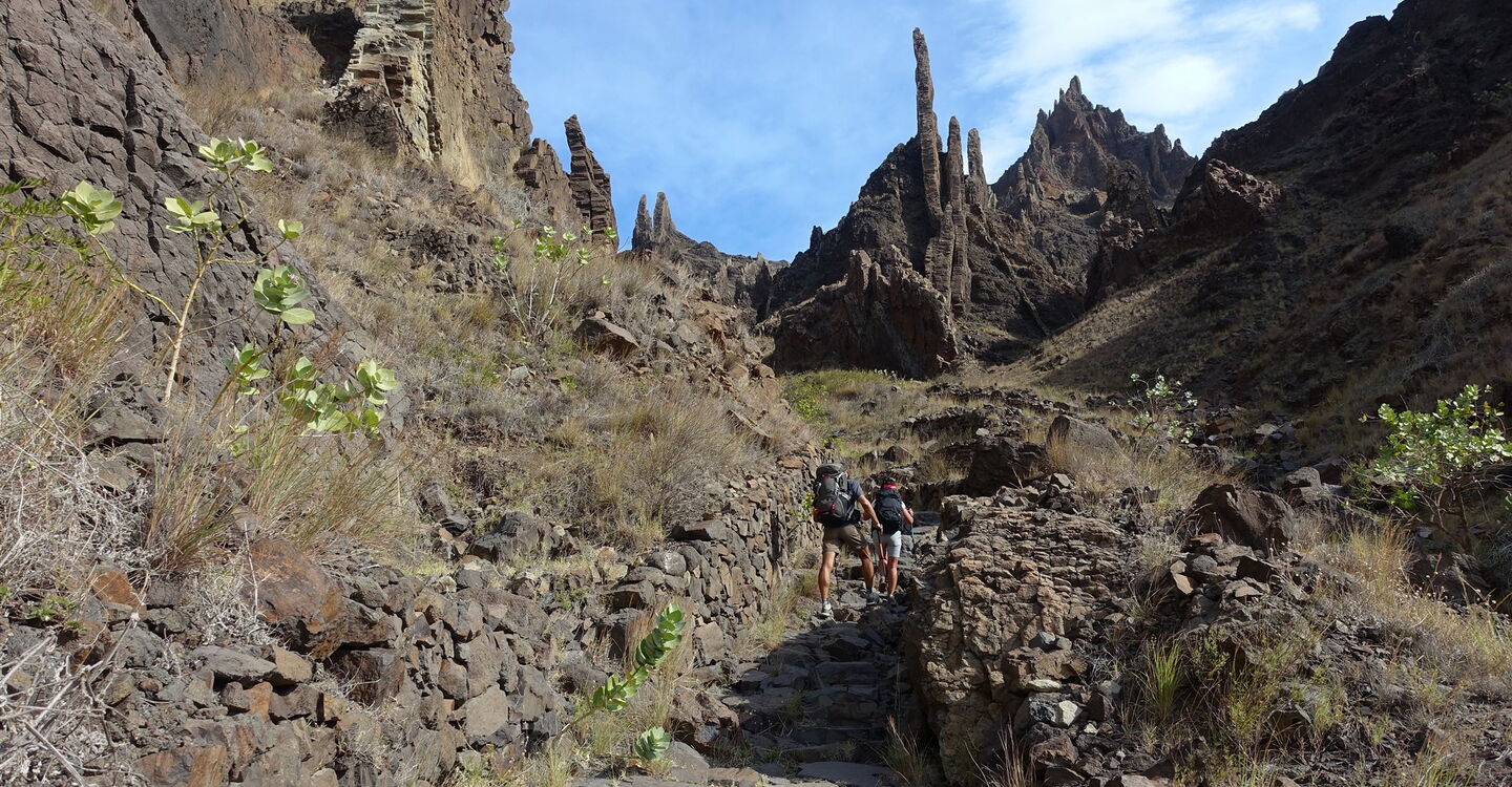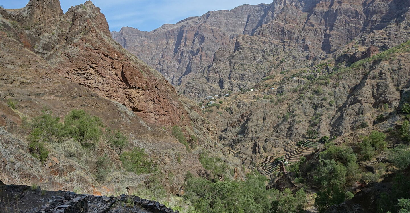 Die einmalige Sehenswürdigkeit auf dieser Tour sind die Spaltenfüllungen entlang des Aufstiegs, die auf Portugiesisch Filöes heißen. Es sind Füllungen aus Magma, die sich während des Vulkanaufbaus bilden. Sie entstehen, wenn Lava zur Oberfläche aufsteigt und entlang von Schwachzonen in das Vulkangebäude eindringt und dort erstarrt. So sehen wir Magmafüllungen mit bis zu 40 m Längsausdehnung und ca. 1 m Breite, die senkrecht zum Nebengestein stehen. Durch Erosion werden diese inneren Strukturen freigelegt, es bleiben die freistehenden Wände. Erst wenn man davor steht, kann man erkennen, wie groß und bezaubernd dieses Naturschauspiel in Wirklichkeit ist. Die Tour führt durch eine immer schmaler werdende Schlucht, die man durch einen spektakulären Felsdurchbruch verlässt, um danach zu einem Bergdorf abzusteigen. Diese kurze Wanderung ist ideal für all diejenigen, die ohne große Anstrengungen eine der schönsten Regionen des trockenen Teils der Insel entdecken möchten.