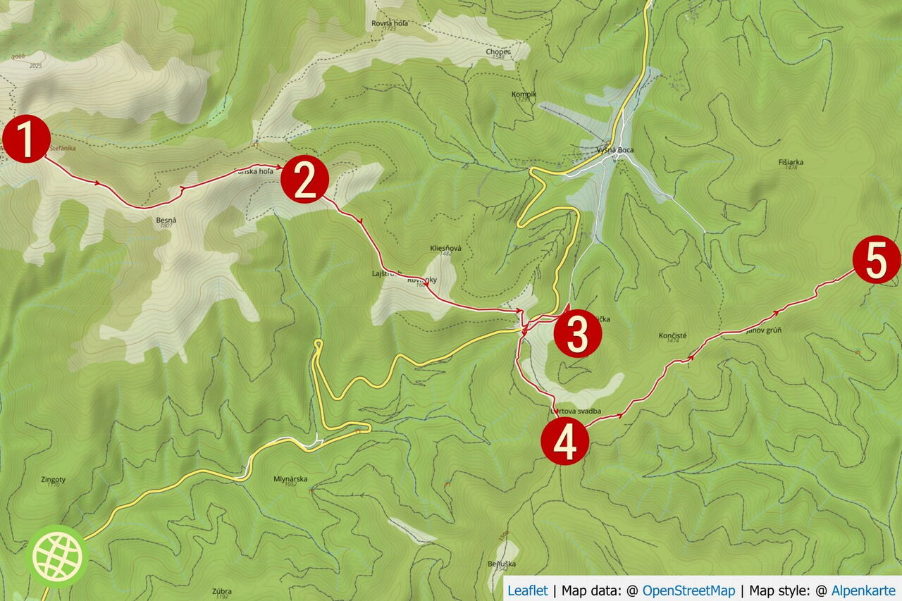 Nach einem beständigen Bergauf und Bergab – wie es in den Bergen nun einmal üblich ist – erfolgt dann der kontinuierliche Abstieg zum Straßenpass Čertovicou. An dieser Stelle gibt es einen Schnittpunkt mit der Wanderung 12. Hier befinden sich direkt an der Straße eine Übernachtungsmöglichkeit und ein Restaurant. Einkaufsmöglichkeiten gibt es hier allerdings keine! Etwas gemütlicher, ursprünglicher und ohne Straßenlärm geht es zu, wenn man hinter der Passstraße links bergab bis zur 03 Chata pod Čertovicou (1091 m) absteigt. Die komfortable Unterkunft ist mehr Hotel als Hütte. | Vyšná Boca 259, 032 34 Vyšná Boca | http://www.Chatapodcertovicou.eu | info@Chatapodcertovicou.com | GPS: 48.906157 19.744303 |
