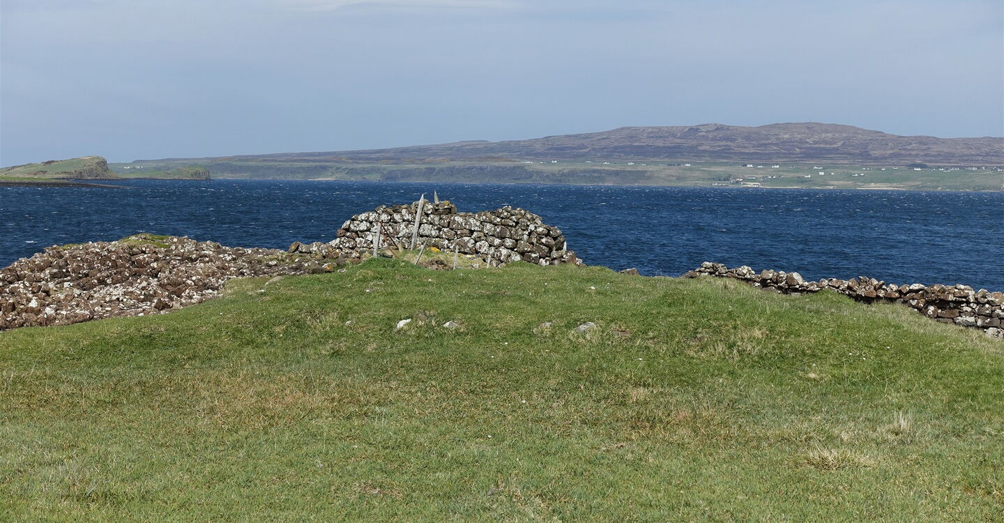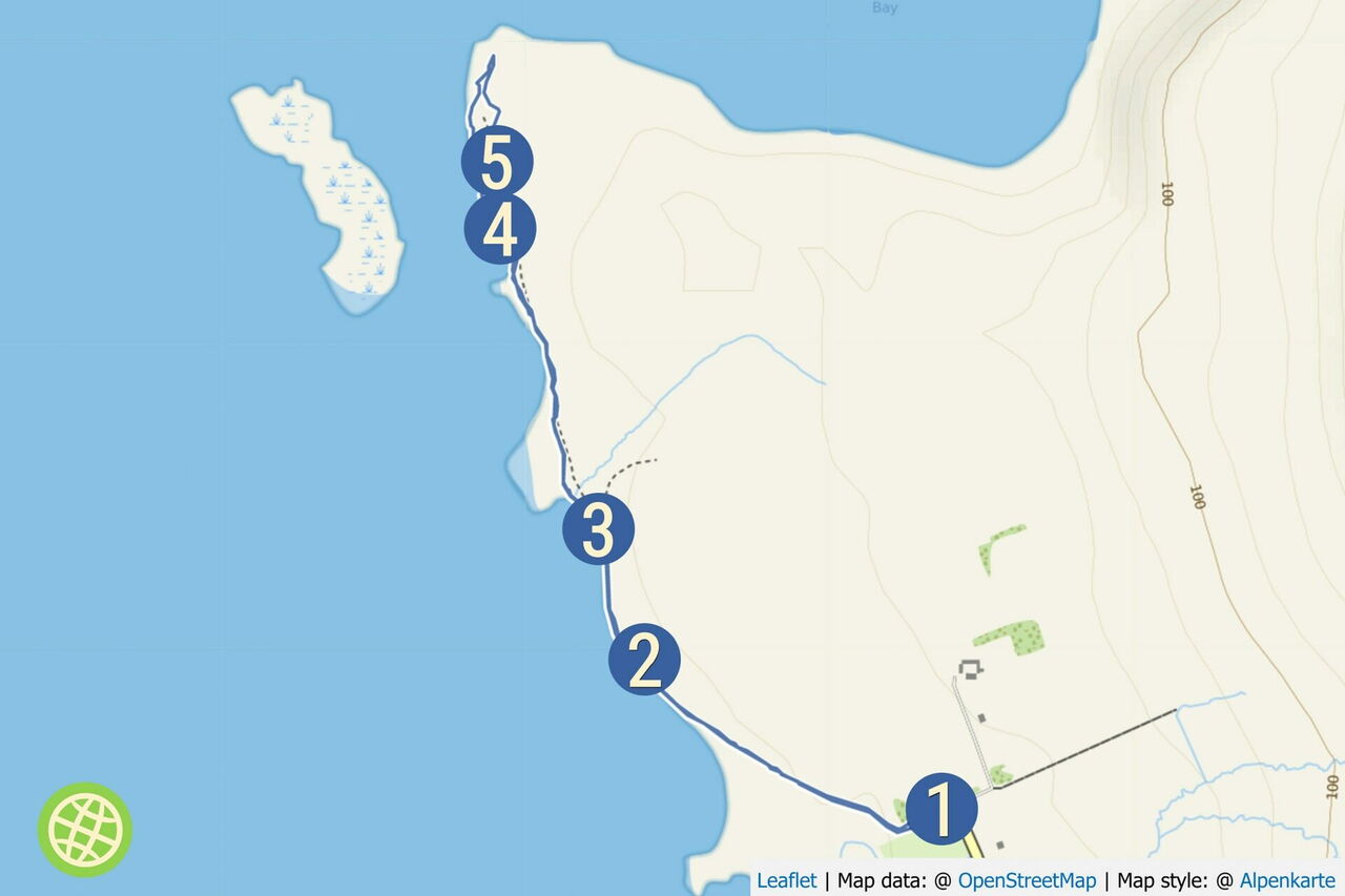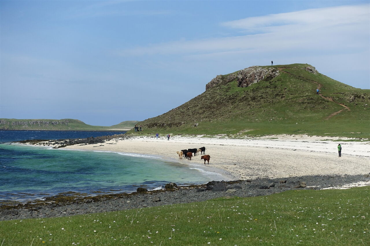 Bei einem einzelnen Haus und der darauffolgenden Pforte geht es dann auf einer Piste weiter. Einen links bergauf führenden Weg ignorieren wir, kurz später passieren wir ein weiteres Gatter. Achtung! Bei einer Linkskehre der Asphaltstraße – hier befindet sich ein mintgrüner abgestellter alter Lastwagen – verlassen wir die Straße nach halb rechts. Vor einem einzelnen Haus verläuft der Pfad halb rechts Richtung Meer. Wir erreichen die Bucht von 02 Kilmarie (3 m), einst Heimat von Iain Anderson, dem Frontmann von der 1967 gegründeten Band Jethro Tull. An der Hauptstraße B8083 biegen wir links ab und gehen bis zu einem Parkplatz vor.