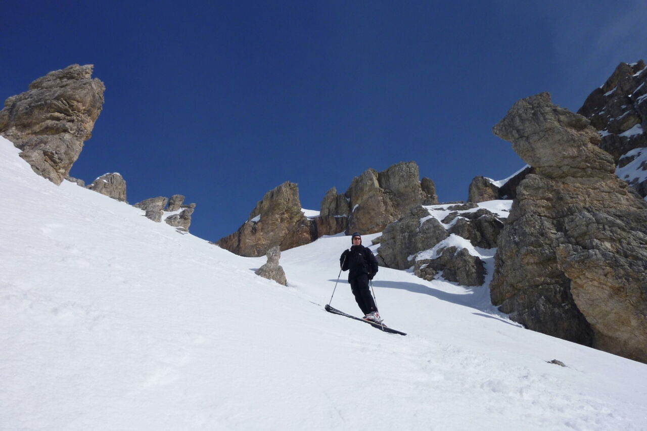 Vor uns liegt eine hervorragende Variantenabfahrt zwischen den Spitzen der Lagzuoi Torries, die bei Firnschnee, wie an unserem Tag, ein großartiges Erlebnis ist. Am unteren Ende treffen wir auf eine Forststraße.