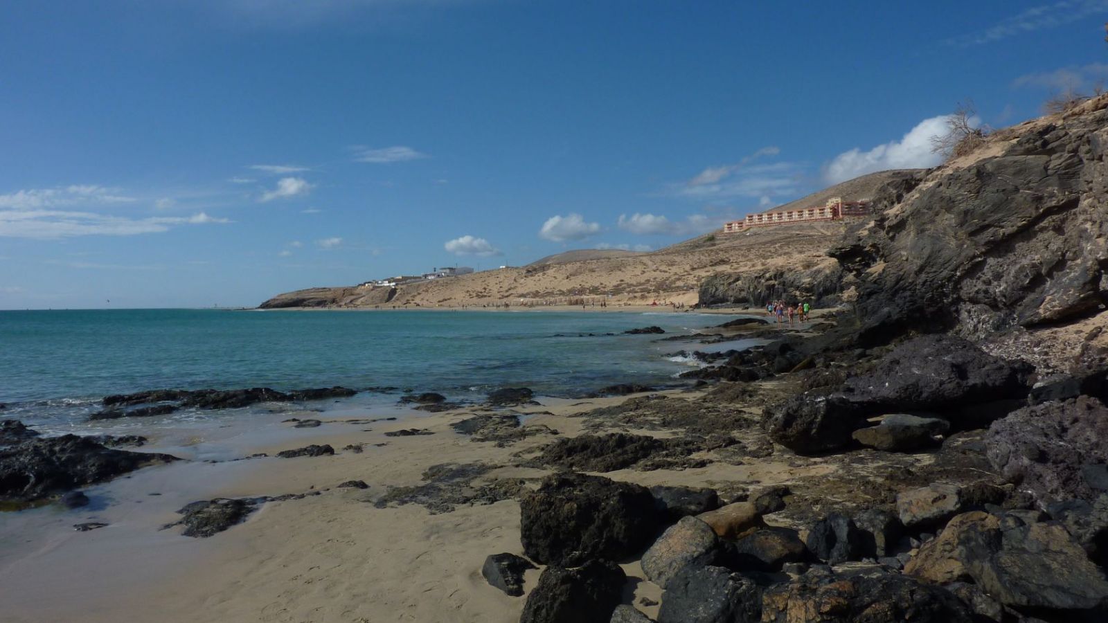 Unterhalb der Hotels H10 Tindaya und R2 Pajara Beach sind wieder Felsen zu umgehen, bis das H10 Playa Esmeralda vorerst das letzte Hotel ist. Nach 3,25 km Fußmarsch kommt die Snack Bar Palmita gerade richtig, wenn nicht vorab für Proviant gesorgt wurde. Nach einer letzten Umgehung von Felsen treffen wir auf die wehenden Fahnen der Surf- und Kiteschule von René Egli. Wir haben den Playa de la Barca erreicht, der hauptsächlich von Surfern besucht wird. Hier finden die jährlichen Surf- und Kiteweltmeisterschaften statt. Auch sehen wir schon halb rechts den riesigen Komplex des (03) Hotel Melia Gorriones (0 m) mit seinen grünen Gärten.