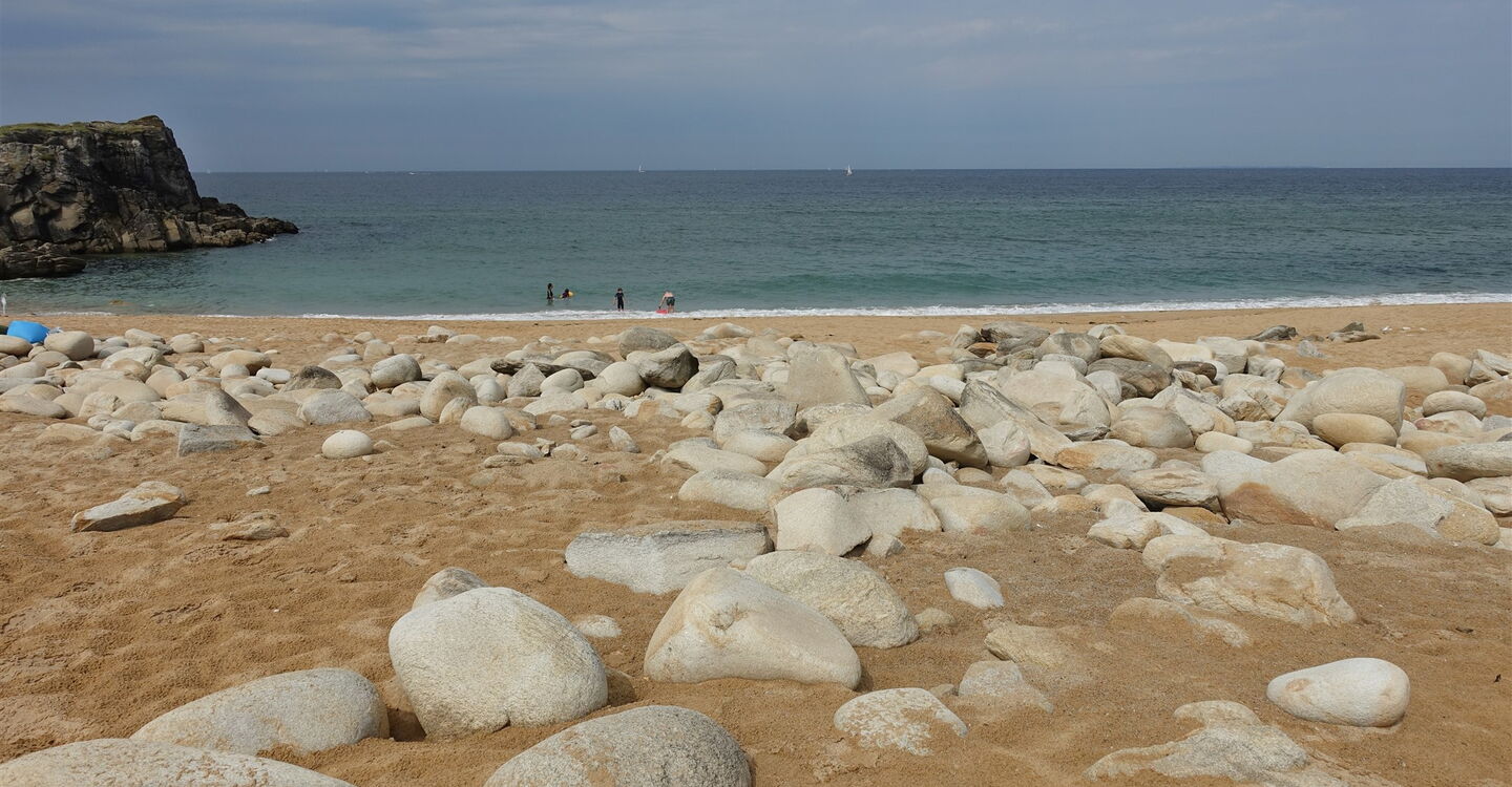 Hinter einer Holzbrücke, gefolgt von einem kurzen Aufstieg, erreichen wir den schönen Sandstrand vom Port Goulom mit verwinkelten und versteckten kleinen Buchten. Besonders schön ist aber der nachfolgende 03 Port Bara (8 m) mit seinen riesigen rund geschliffenen Felsen. Er ist dank der Pointe du Percho besonders gut vor dem meist sehr kräftig wehenden Wind aus Nordwesten geschützt. Immer wieder führen Pfade auf Landzungen zu Aussichtspunkten. Die Wegführung ist stets eindeutig, es geht entlang der Küste.