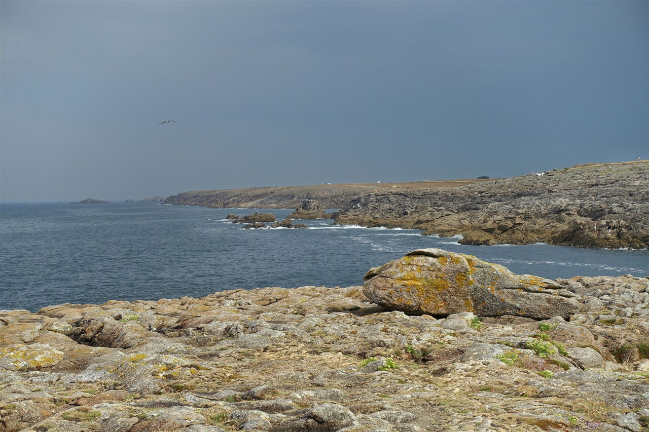 Die Promenade endet und wir gehen nun auf einem ausgewiesenen Wanderweg, bis wir den ersten atemberaubenden Aussichtspunkt erreichen, das 02 Kap Beg er Goalennec (8 m) – man schaut fast endlos in nördliche Richtung entlang der zerklüfteten Küste. Hinter einer kleinen Hütte am Parkplatz beginnt der weiterführende Pfad. Auf einem Holzbohlenweg passieren wir eine nicht besonders schöne Sandbucht. Kurz später endet der Pfad, wir gehen links und gelangen so wieder auf einen Pfad. Bei einem großen Stein erreichen wir den Aussichtspunkt Grote de Kerniscop und kurz später die erste schöne Sandbucht, den Port Guibello.