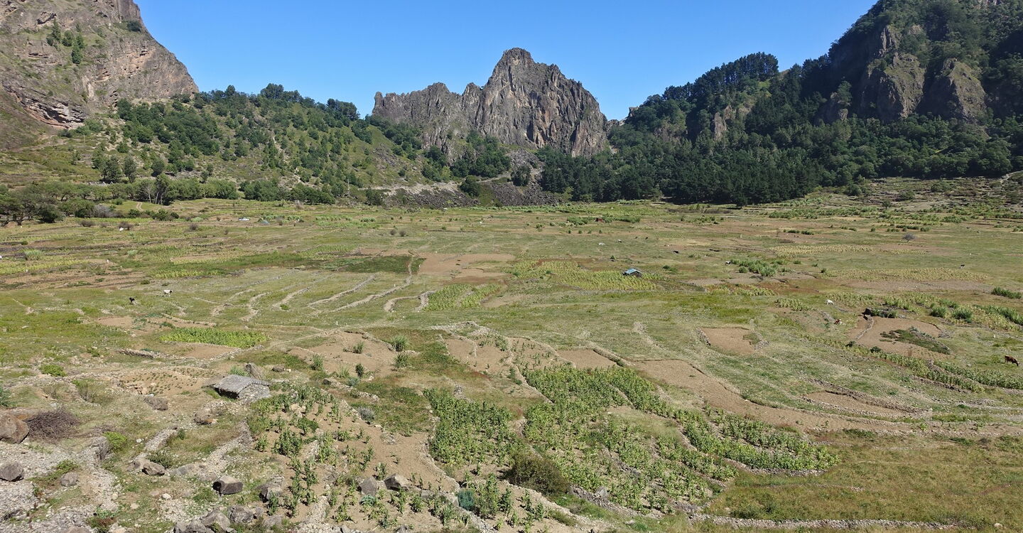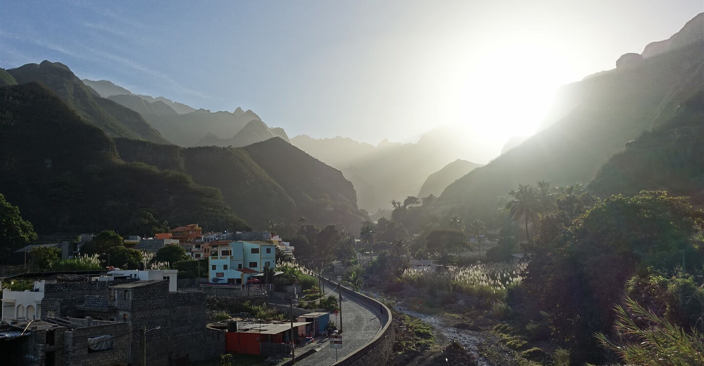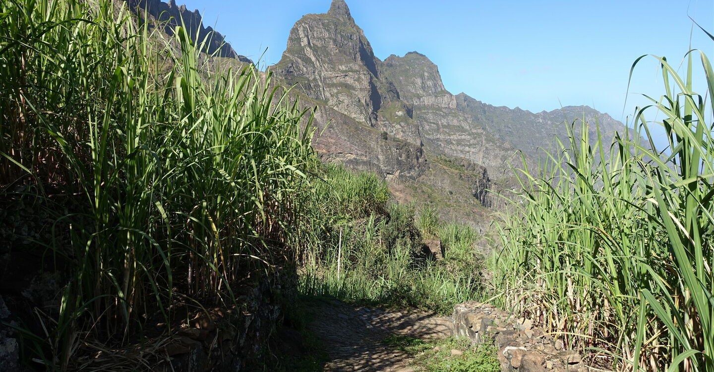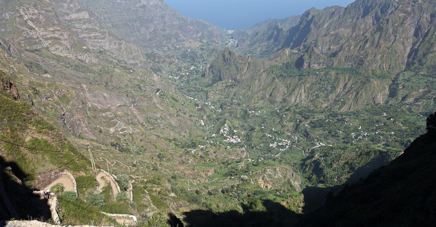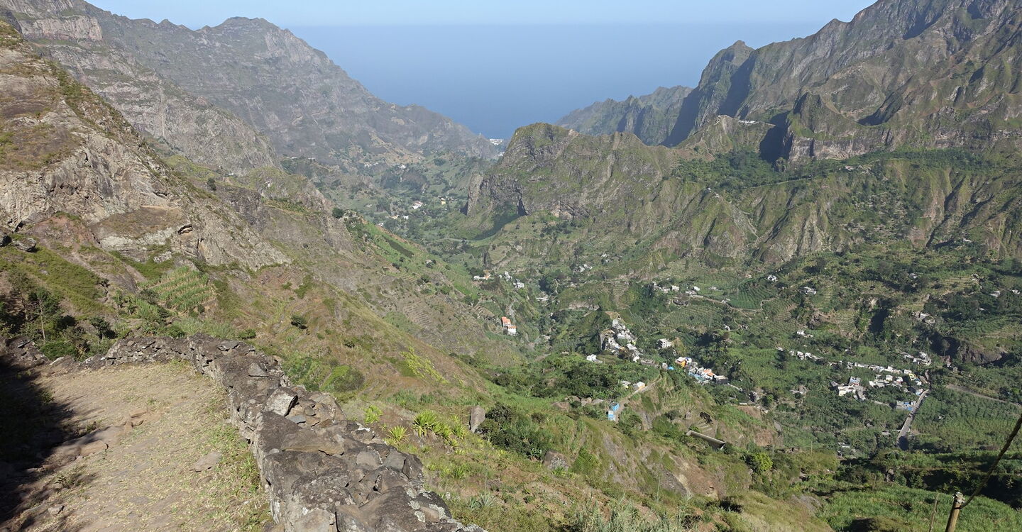Die nachfolgend beschriebene Route ist die bekannteste und meistgelaufene Tour auf Santo Antão. Sie beginnt am 1300 m hoch gelegenen und monumentalen Kraterrand des Cova de Paúl. Der Vulkan beendete vor ca. 3 Millionen Jahren die Zeit der Vulkanausbrüche und damit die letzten vulkanischen Aktivitäten auf der Insel. Die dort häufig auftretenden Passatwolken und die daraus resultierende Feuchtigkeit ermöglicht auf dem Vulkanboden der Caldera den ganzjährigen Anbau von Obst und Gemüse. Während des Abstiegs durch die felsige Steilwand des Cabo da Ribeira, ergeben sich unvergessliche Fernblicke über die schroffe Felsenwelt und Kulturlandschaft, bis hin zum Atlantischen Ozean. Im grünen Tal werden Zuckerrohr, die berühmten kleinen, zitrusartig frisch schmeckenden Bananen, Papaya, Mango, Orangen, Avocado, Süßkartoffel, Yamswurzelgewächse, Maniok und Kaffee angebaut. Nadelbäume am Kraterrand, große Brotfruchtbäume mit ihren kugelrunden grünen Früchten, riesige indische Mandelbäume und Eukalyptusbäume säumen den Erlebnispfad. Während die Natur ihre schönsten Geschichten erzählt vergessen wir vielleicht die 1470 Höhenmeter bergab, bei einer Gesamtstrecke von 12 km.
