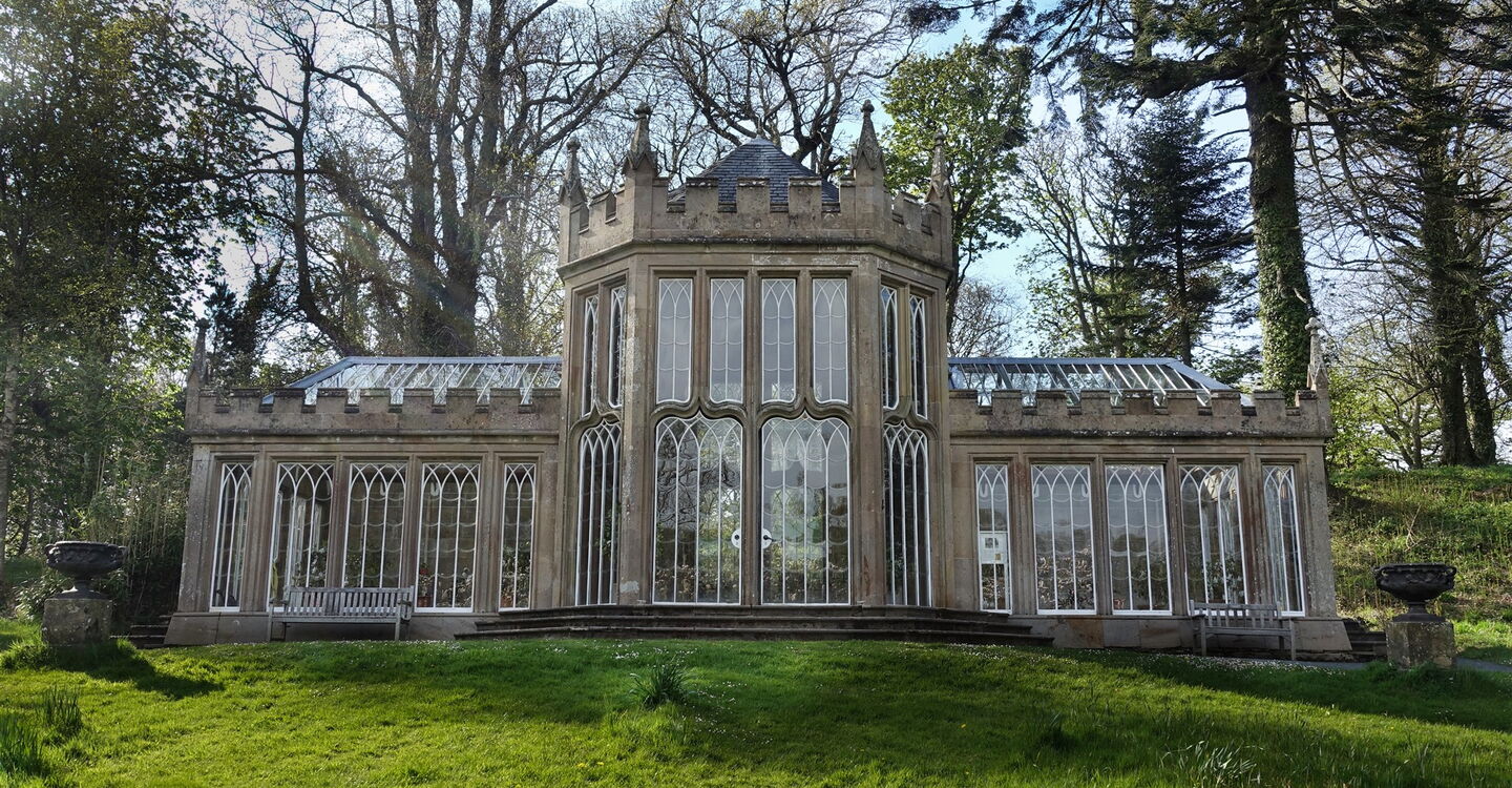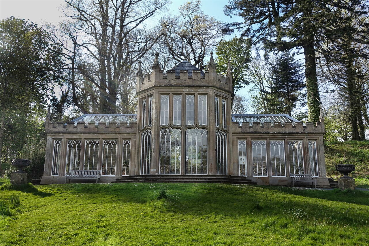 Wir gehen am Strand entlang, kommen an einer Felsnase vorbei und nehmen an dem alten Bootshaus den Pfad mit einem Geländer bis zu einer Geschützgruppe. Bei den Kanonen gehen wir links, queren die vor uns liegende Rasenfläche zu einem Mauerdurchlass und kommen an der Orangerie und den Gärten mit einem riesigen Springbrunnen vorbei, direkt vor dem 03 The Culzean Castle (27 m). Es wurde im 18. Jahrhundert von Robert Adam – man sagt, es sei sein letztes großes Meisterwerk – für David Kennedy, den 10. Earl von Cassillis, als romantisches Schloss entworfen. Im Jahr 1945 wurde das Castle an den National Trust for Scotland (NTS) übergeben, der es bis heute vermarktet und unterhält.