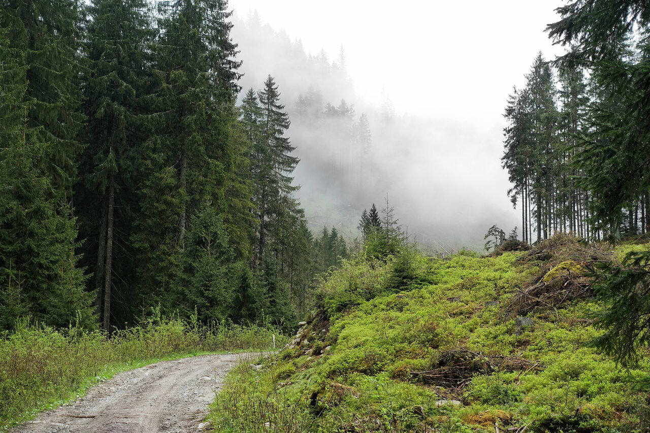 Beim 01 Parkplatz Lúčky (938 m) gehen wir zunächst in östlicher Richtung an der Chata Lúčky links vorbei. An der darauffolgenden Straßengabelung nehmen wir den linken Arm. Auf der Piste gehen wir bis zur Informationstafel 11 und nach der Wegsperre direkt entlang des Bachlaufes – auf einem grün markierten Wanderweg. Bei einer Brücke bleiben wir auf der Forststraße. Kurz hinter einer auf 10 t limitierten Brücke zweigt halb rechts unser Wanderweg ab. Er führt zwischen zwei Baumstümpfen mit grünen Markierungen hindurch.