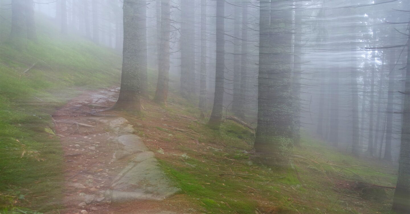 50 m bevor die Piste nach halb links den Bachlauf queren würde, zweigen wir abermals halb rechts ab. Auch hier befinden sich grüne Markierungen. Wir erreichen die Informationstafel mit der Nummer 10. Der nachfolgende Aufstieg führt durch einen ursprünglichen und intakten Wald. Wir erreichen die Informationstafel mit der Nummer 9. Unser Weg endet am 02 Záver Širokej doliny (1416 m) und wir gehen nicht geradeaus weiter, sondern rechts auf dem rot markierten und mit Felsen verlegten Pfad. Wir überqueren zwei Bachbetten und erreichen die Informationstafel mit der Nummer 8 sowie die Schneise einer Skipiste. Diese überqueren wir, um am rechten Pistenrand bei roten Wegweisern den Aufstieg fortzusetzen.