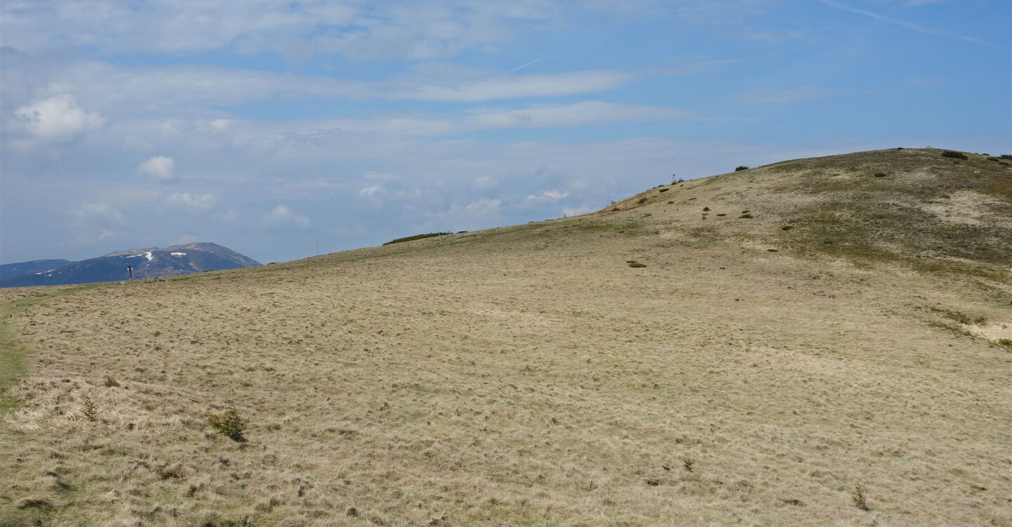 Im Weiteren überqueren wir den Malá Chochuľa (1719 m) und erreichen nachfolgend den 03 Veľká Chochuľa (1753 m) – der höchste Gipfel auf der heutigen Etappe. Oft wehen starke Winde auf dem exponierten Bergrücken, dann wird es schnell kühl, besonders wenn Wolken und Regen dazukommen. In diesem Fall wird auch die Sicht sehr schlecht, trotzdem ist die Orientierung aufgrund der vorzüglichen Wegmarkierungen kein Problem.