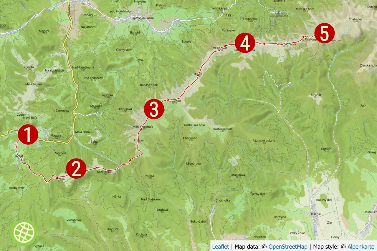 Nachdem wir unterhalb des Gipfels des 1750 m hohen Ďurková vorbeigegangen sind, verlassen wir bei der nächsten Möglichkeit den Hauptweg auf dem Bergrücken nach rechts und steigen zur 05 Útulňa pod Chabencom (1623 m) ab. 100 m neben dem Haus befindet sich eine Quelle, für Verköstigung sorgen die Hüttenwirte. Die Hütte verfügt über 40 Bettenlager und ist ganzjährig bewirtschaftet. Tel.: +421944165853. GPS: 48.931050 19.466840.