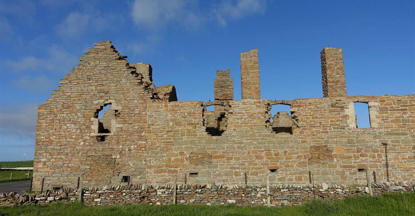 Nach 600 m erreichen wir die gering befahrene Anfahrtsstraße und folgen dieser rechts herunter zum 05 Earl's Palace (Birsay) (12 m). Ein verbauter Stein zeigt die Jahreszahl 1574. Das Gebäude diente als Ersatz für den Earl's Palace in Kirkwall und ein Jahrhundert später nutzten es die Earls of Morton. Seit dem 17. Jahrhundert ist das Bauwerk nicht mehr bewohnt und somit dem Verfall preisgegeben.