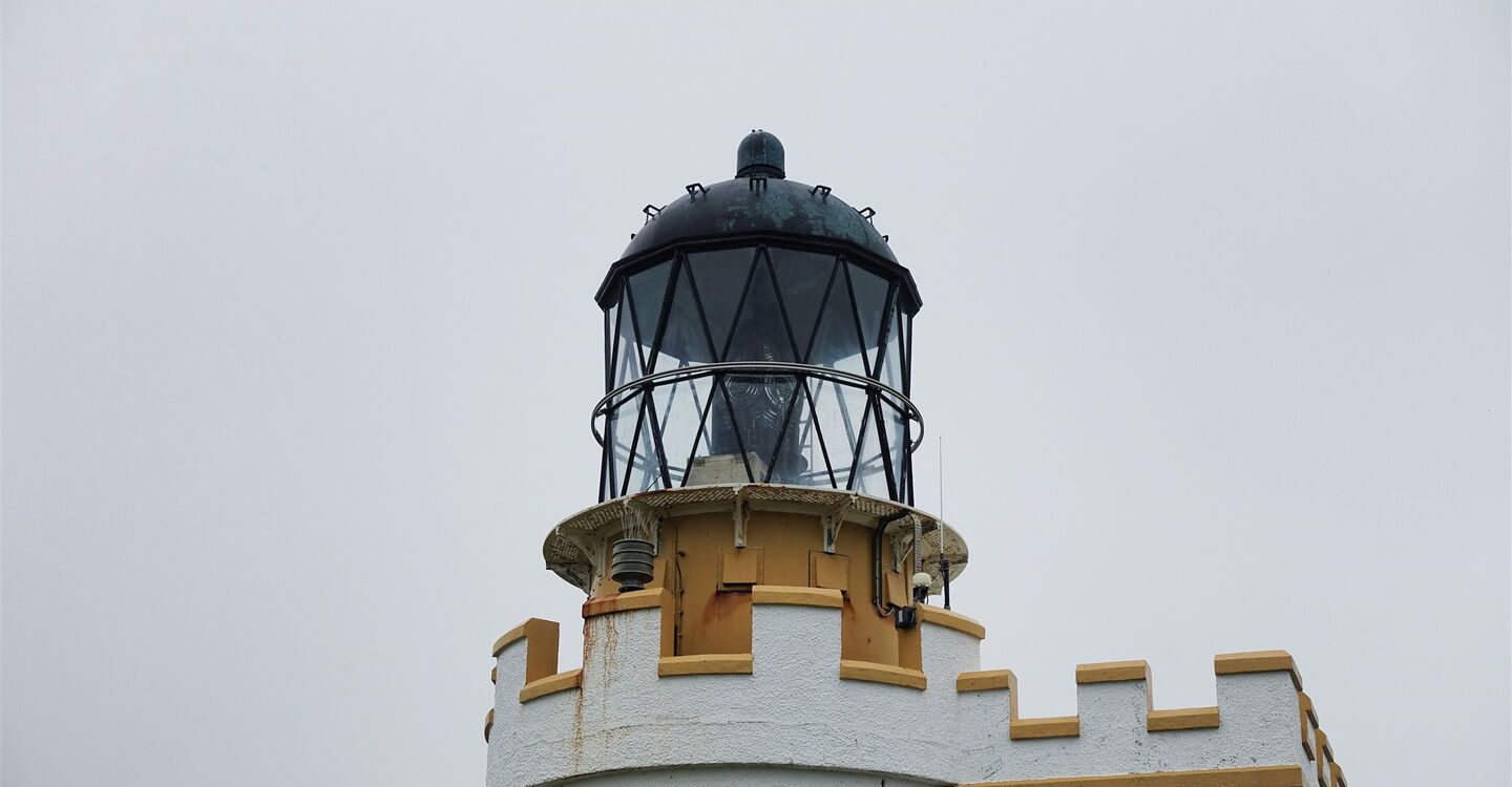 Hinter diesem befindet sich ein erstes kleines Gatter. Hinter dem zweiten Gatter gehen wir an der Weggabelung geradeaus und weiter auf dem grasigen Pfad in Richtung des 03 Lighthouse (52 m). Der 1925 erbaute Leuchtturm ist nur 11 m hoch, steht dafür aber 52 m hoch über dem Meeresspiegel. Von dort aus gehen wir in südlicher Richtung an der spektakulären Steilküste entlang. In den geschützten Felsen nisten Eissturmvögel, Trottellummen, Tordalken und Papageientaucher. Wir überqueren wieder die Meeresenge, steigen die Treppen zum Parkplatz hoch und gehen dort links weiter entlang der Küste, auch ausgeschildert Richtung Skiba Geo.