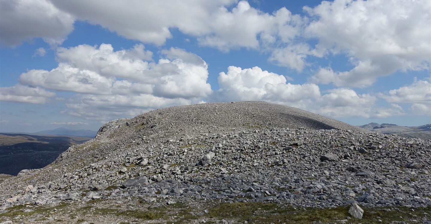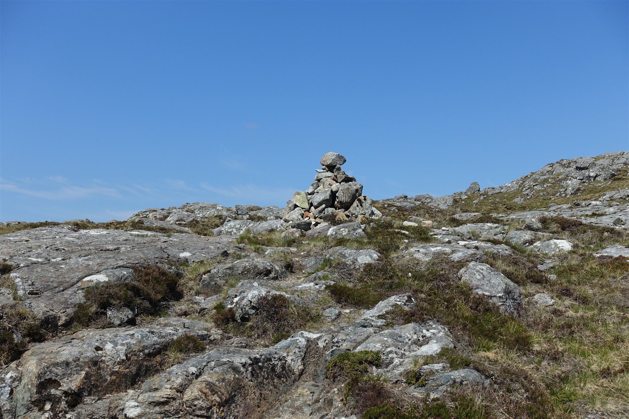 Auf der darauffolgenden Hochebene gehen wir über platt geschliffene Steine bis zum Gipfel des 05 Glas Bheinn (776 m). Zur weiteren Wegbeschreibung: Blickt man vom Gipfel Richtung Osten, so sieht man auf der rechten Seite des Gipfelplateaus einen Steinhaufen. Wir queren die Hochebene ca. 100 m links von diesem Steinhaufen. Danach erreichen wir die östliche Bergflanke des Glas Bheinn, an dessen Grat wir bis zu einer kleinen Senke bergab gehen. An dieser orientieren wir uns halb rechts und gehen ein kleines Stückchen bergauf, um dann auf dem lang gezogenen Bergrücken weiter abzusteigen – auf einem Pfad, der nur schwer auszumachen ist. Bei einer kleinen Einsattelung und einem Steinmännchen fangen wir an, links durch eine steile grasige Rinne in Richtung des im Tal querenden Pfads herabzusteigen. Von dort gehen wir rechts Richtung Straße und Parkplatz.