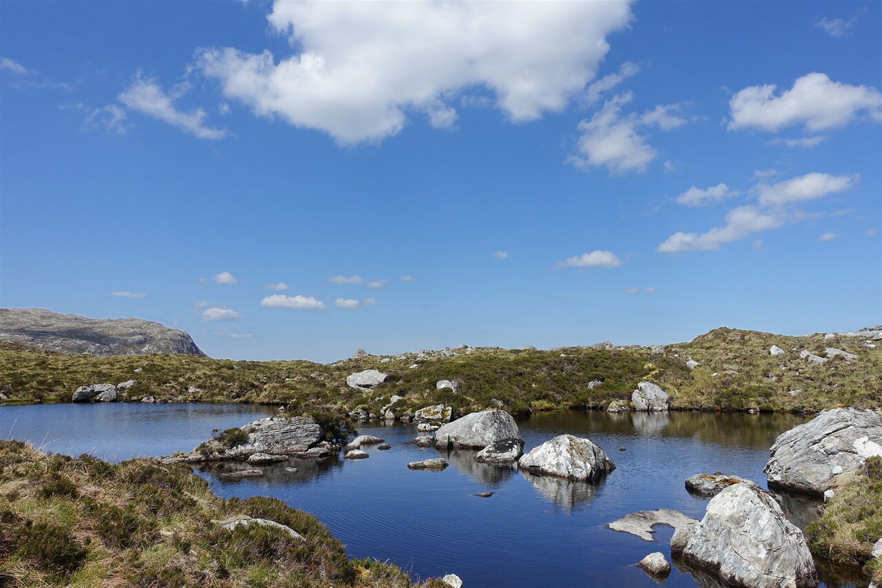 Vom 01 Start und Ziel (226 m) verlassen wir das östliche Ende des Parkplatzes erhöht auf den Überresten der alten Fahrspur – oberhalb der Kehre der Straße. Sobald wir freien Blick auf den See halb rechts haben, gehen wir bei einem weißen Stein halb links auf den beginnenden Pfad, der sehr sumpfig sein kann. Über Steine queren wir den Abfluss des Sees und steigen nun weiter auf dem erodierten Pfad auf. Sobald wir den See hinter uns gelassen haben, wird der Weg steiniger und wir erreichen den Loch Bealach a Bhuirich.