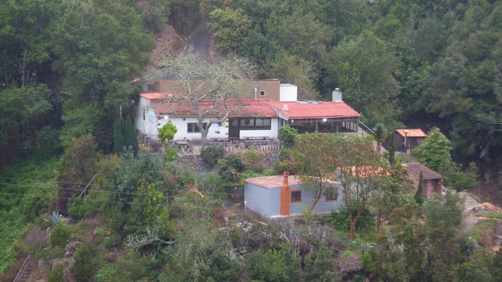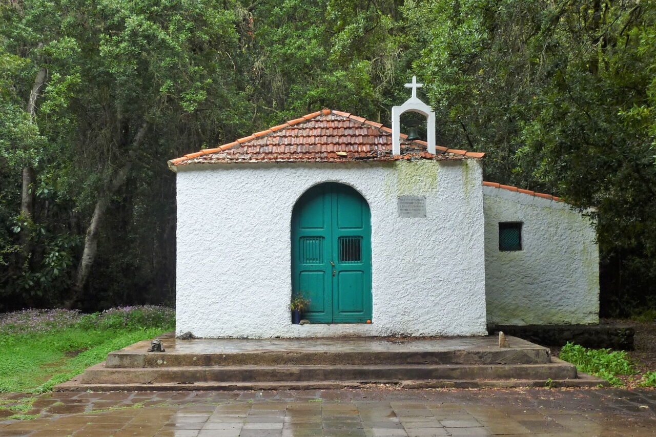 Bereits nach einigen Metern verlassen wir die Fahrstraße nach links und erreichen die (04) Ermita de Lourdes (969 m). Vom kleinen Kirchplatz führt halb links ein Weg direkt zum Weiler El Cedro - dies ist die Variante, um den Wasserstollen zu umgehen. Wir gehen jedoch auf dem etwas erhöhten Weg in nördliche Richtung weiter durch den Nebelwald, um bei der Fahrstraße rechts zu gehen und den folgenden Abzweiger nach rechts zu ignorieren. In einer scharfen Rechtskurve verlassen drei Wanderwege die Fahrstraße nach links. Wir begehen den rechten dieser Wege Richtung Hermigua und steigen zunächst durch den Wald ab.