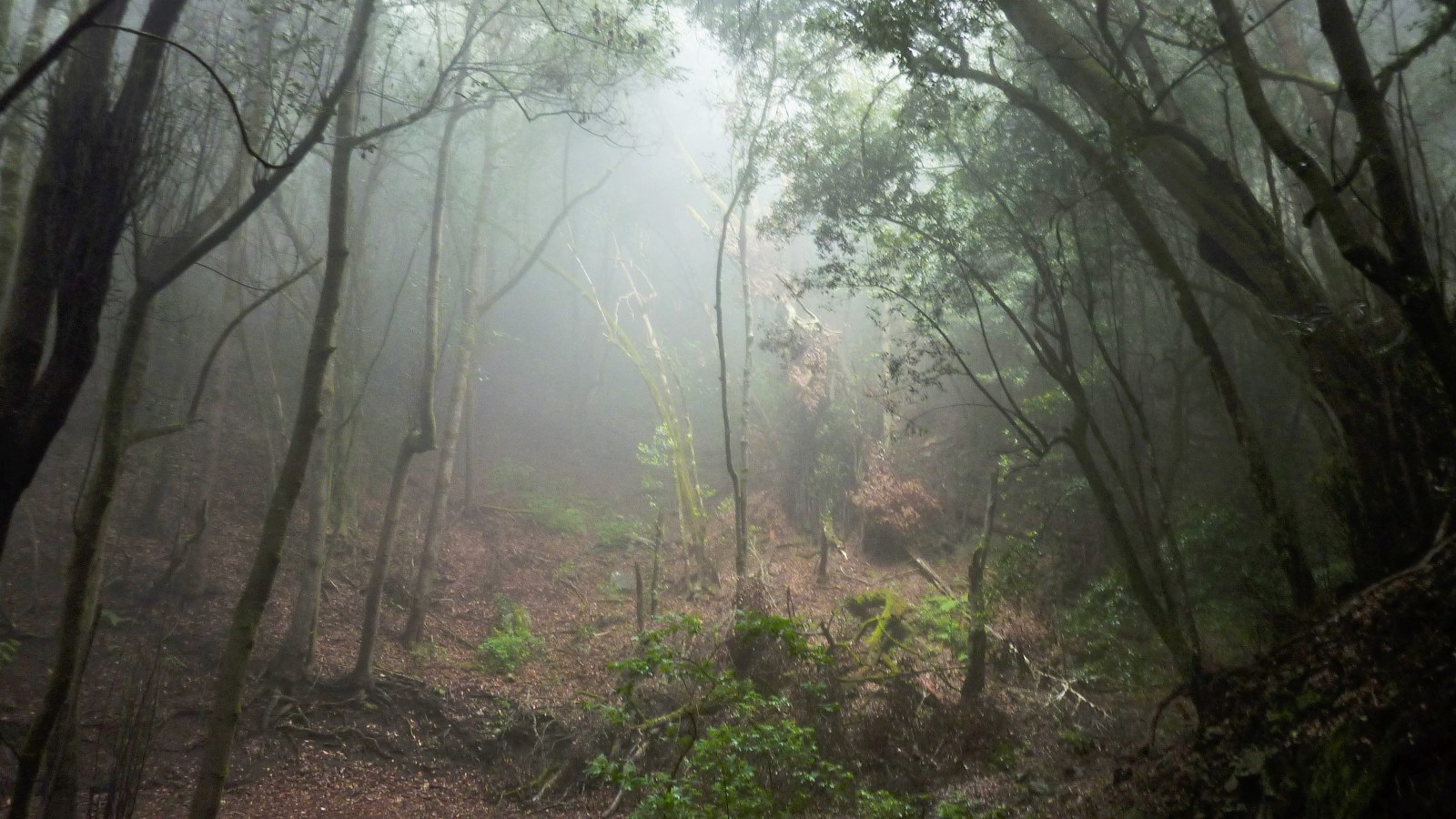 Es folgt ein 2,5 km langes Stück durch den immer tiefer und dunkler werdenden Nebelwald, bis wir nach einer Linkskehre das Barranco del Cedro überqueren. Wir haben den Parkplatz (03) Las Mimbreas (982 m) erreicht.