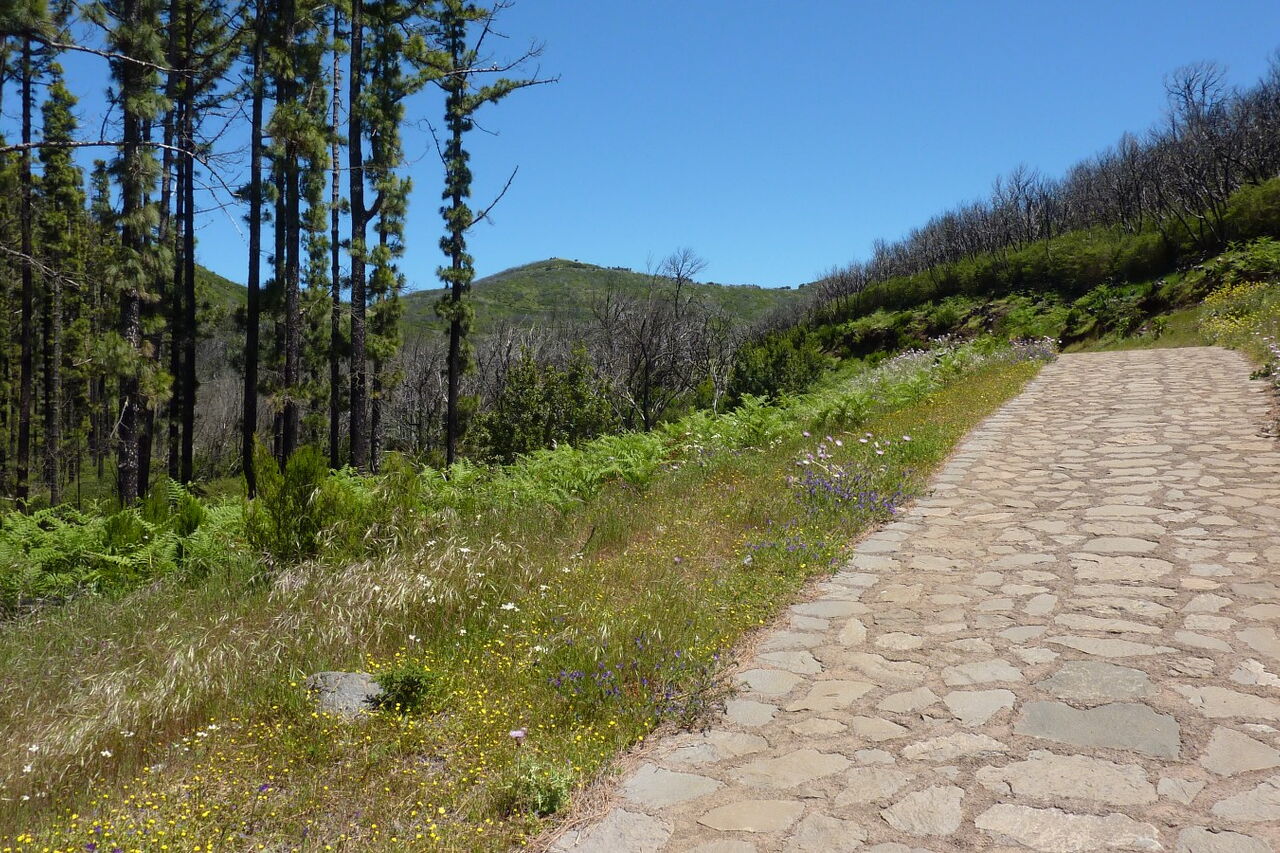 Nach 1,4 km treffen wir auf eine weitere Forststraße, folgen dieser halb links weitere 130 m, um dann bei der Weggabelung scharf rechts auf dem gepflasterten Weg bis zum (05) Alto de Garajoney (1487 m) aufzusteigen. Er ist die höchste Erhebung der Insel und überragt das umliegende Hochplateau um wenige Meter. Auch wenn das Dach von La Gomera daher kein exponierter Gipfel ist, haben wir einen imposanten Ausblick auf die gesamte Insel. Bei guter Sicht kann man sogar die Nachbarinseln Teneriffa, La Palma und El Hierro ausmachen. Oft hüllen aber fette Passat-Wolken die Bergspitze ein. Wir überschreiten den Gipfel und laufen auf einem Bergrücken in nordöstlicher Richtung, bis in einer Mulde links ein Pfad abzweigt. Nach 50 m gelangen wir auf den gepflasterten Weg, um auf diesem rechts herunter bis zum Ausgangspunkt laufen.