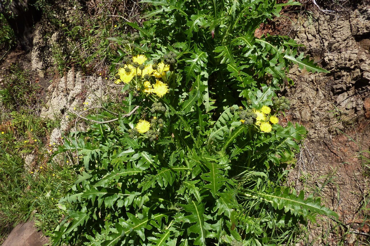 Wir erreichen die GM-2, gehen ein kurzes Stück auf dem beginnenden Forstweg nach links, um dann sofort (02) rechts (1331 m) auf dem hier beginnenden Pfad Richtung Laguna Grande weiterzugehen. Auf dem folgenden Wegstück würden wir normalerweise durch einen dichten Nebelwald gehen, aber nach den letzten Waldbränden wurde dieser leider komplett zerstört - geblieben sind nur die schwarzen verbrannten Stummel. Dieser Umstand gibt wiederum dem Bäumchen-Löwenzahn die Möglichkeit, prachtvolle gelbe Blüten in den Himmel zu strecken.