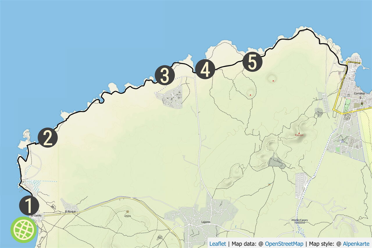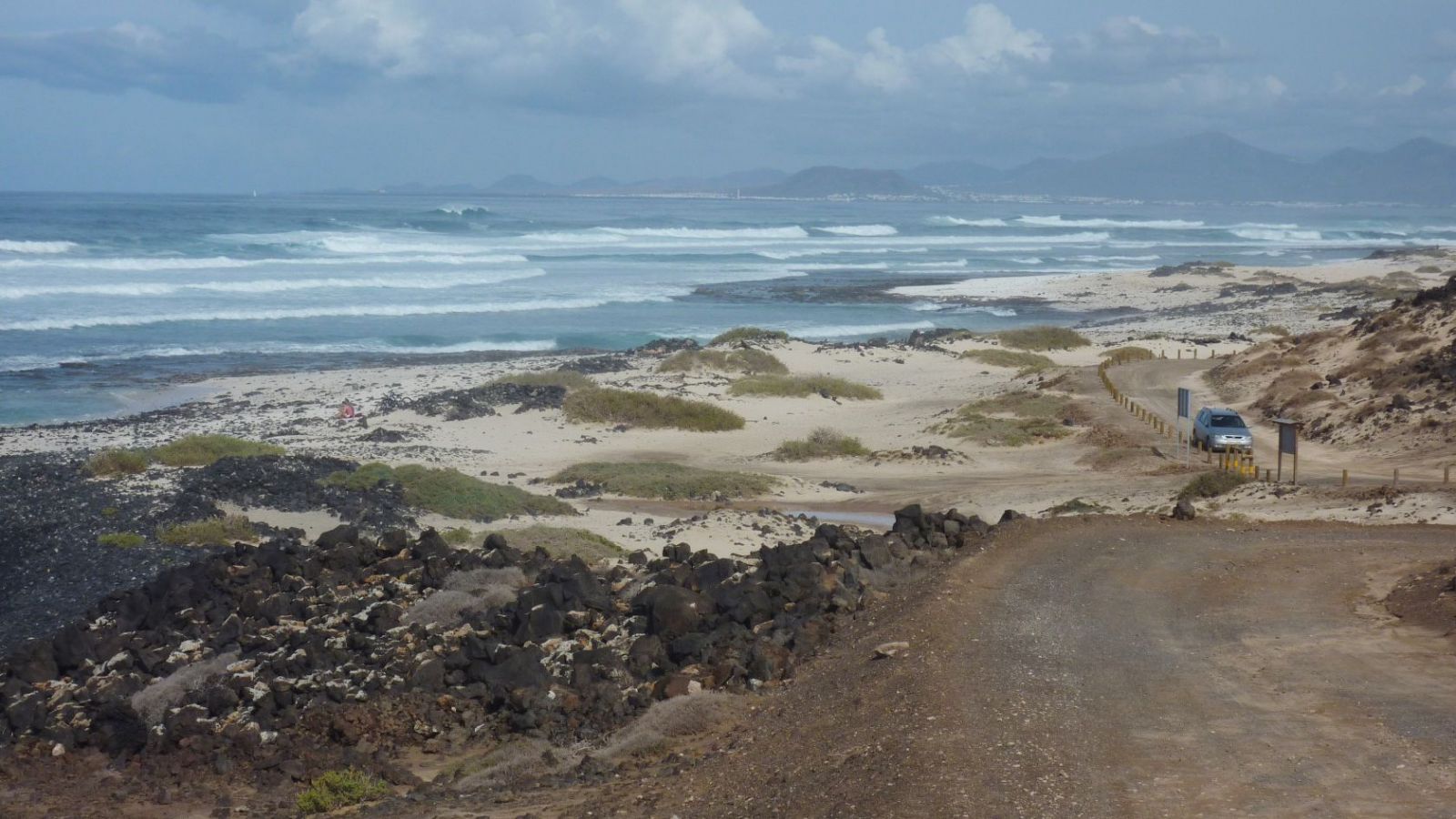 Vom (01) Start El Cotillo (27 m) gehen wir auf der Hauptstraße in westliche Richtung bis in das Ortszentrum und dort direkt auf einem der vielen Pfade entlang der Küste – nun in nördliche Richtung. Vorbei führt der Weg an einer Reihe wunderschöner Sandstrände (Playa Marfolín, Playa Islote und Playa Beatriz) mit weißem Sand. Bei Ebbe ergeben sich hier perfekte Badebuchten. Entgegen der Meinung, der weiße Sand stamme aus der Sahara, besteht der Sand der Strände aus Körnern organischen Ursprungs, wie von Muschelresten oder Restmaterialien kalkhaltiger Algen. Im Zusammenspiel mit dem Wind bildeten sich kleine Dünenfelder, wie wir sie entlang der Küste bei El Cotillo bewundern können. Die Wanderung führt direkt am Strand entlang. Es wechseln immer wieder sandige Buchten mit felsigen Abschnitten.