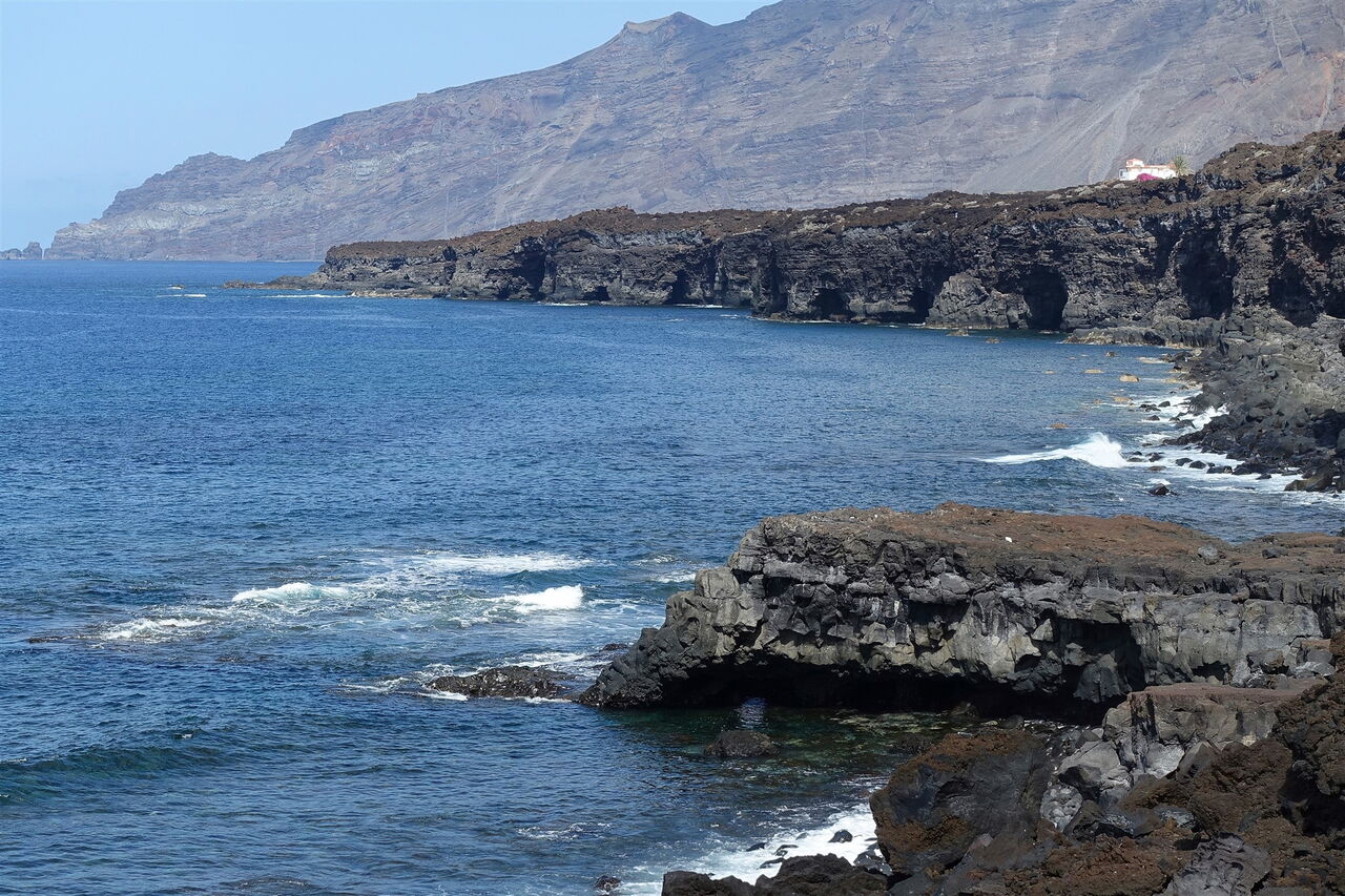 Von der Landzunge am Playa de Los Corrales im Halbrund des (01) El-Golfo-Tals (16 m) steigen wir wieder zur Verbindungsstraße von Las Puntas nach Sabinosa auf und queren diese nach halb rechts, um auf der bergauf führenden Straße entlang von gepflegten Grundstücken bis zu deren Ende aufzusteigen, das sich kurz hinter einem Wasserreservoir befindet.
