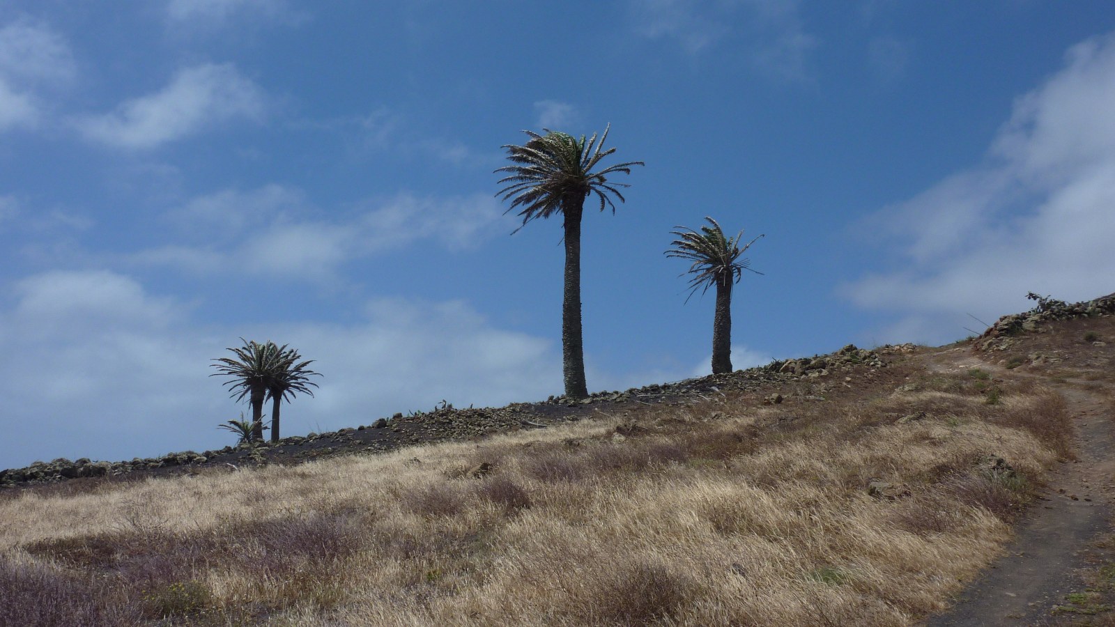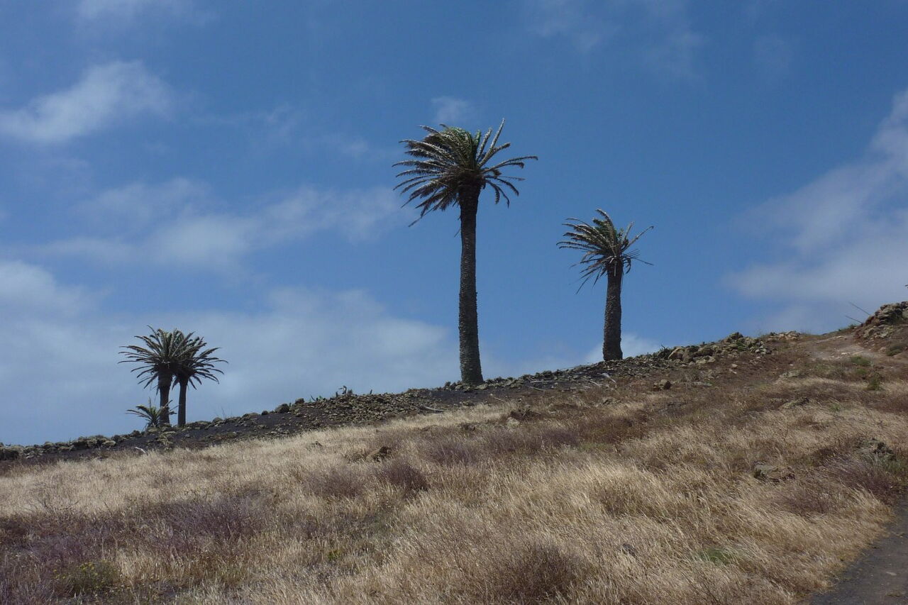 Nach einer kleinen Anhöhe zweigt bei einem halbhohen Wegweiser der Inselregierung (02) (361 m) rechts ein Weg an einem weißen Haus mit grauer Tür ab. Der Weg geht nun steil bergauf und das weiche Lavagranulat erschwert das Gehen. Nach 340 m endet der Weg und wir gehen rechts für weitere 500 m, bis wir zu einem vereinzelt stehenden Haus auf der linken Straßenseite kommen. Hier verlassen wir den Hauptweg hinter uns und gehen rechts in südliche Richtung. Bereits nach 50 m nehmen wir den Abzweiger nach rechts und gehen an einem verlassenen Haus vorbei. Der Weg führt uns nun in Richtung vereinzelt stehender Palmen, die etwas erhöht im vor uns liegenden Hang stehen.