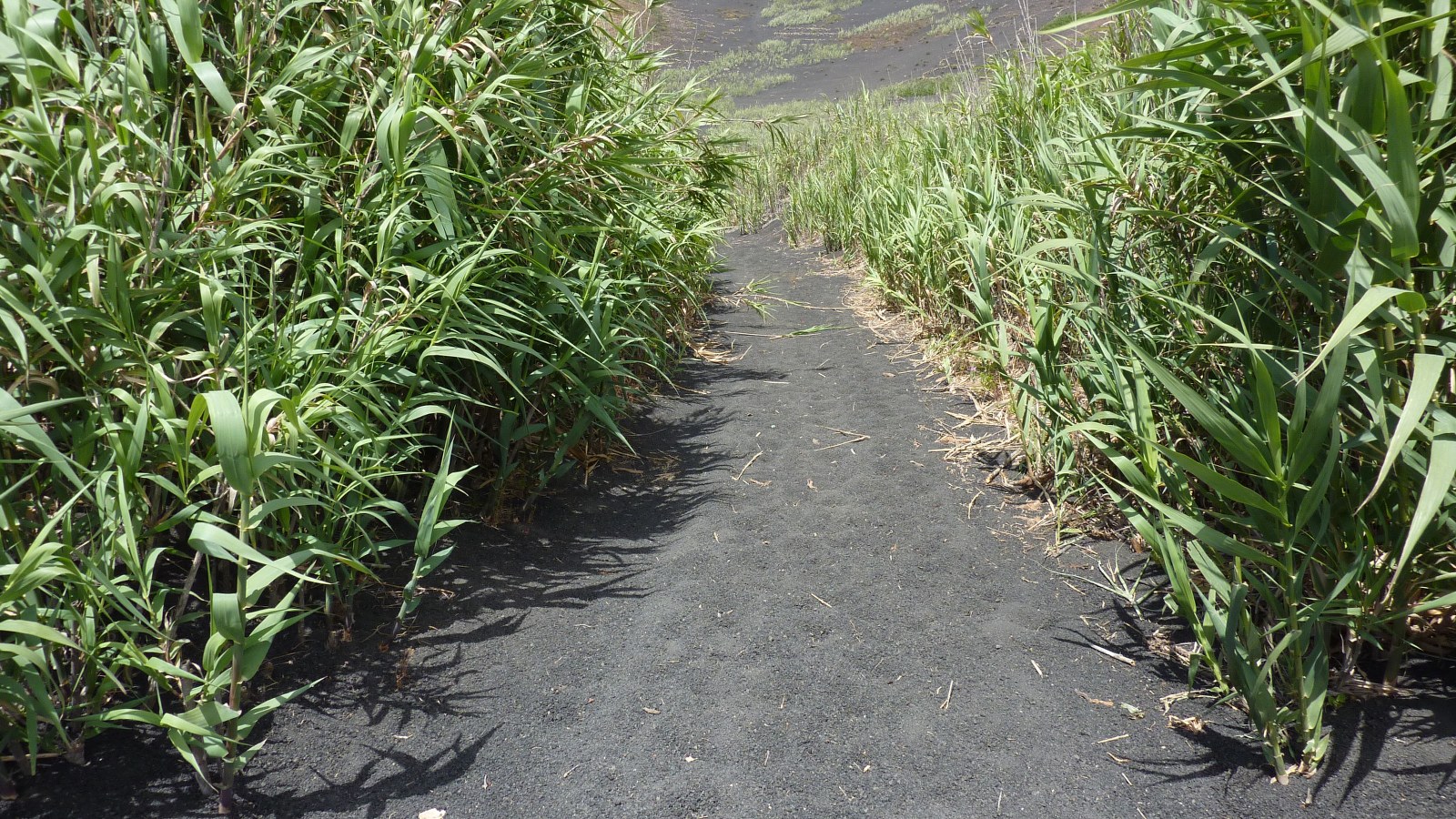 Kurz hinter den Palmen lassen wir den Abzweiger links zu einem Kakteenfeld liegen und gehen durch eine Schilfgras-Allee zum Grund des Vulkans (03) Caldera de Gaida (484 m). Am Ende einer Steinmauer - in einer Mulde mit einem schwarzen Lavahaufen - machen wir eine scharfe 315°-Rechtskehre. Weglos geht es nun bergauf, vorbei an niedrig gewachsenen und fast vertrockneten Feigenbäumen, bis auf den Grat des Vulkans. Hier treffen wir auf einen Pfad, dem wir links folgen. Nach einem Feld mit Kakteen haben wir bereits 180 Grad des Vulkankraters begangen.