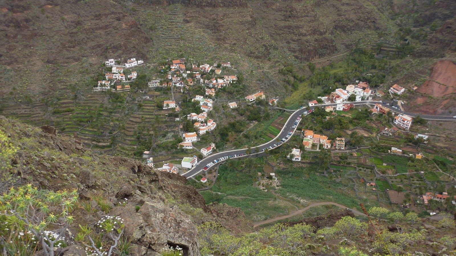 Wir gehen 350 m auf dem gleichen Weg bis zur Einsattelung zurück, um dann links über das Plateau auf einem beginnenden Pfad direkt an den Grat zu gelangen, wo sich uns ein gigantischer (04) Blick in das Valle Gran Rey (590 m) bietet. Auf unserem weiteren Weg gehen wir in gebührendem Abstand oberhalb dieser Klippe bergauf Richtung Las Pilas. Auf dem letzten Stück umlaufen wir den Las Pilas in einer 180-Grad-Kehre, bis wir auf die erste Ruine mit Dreschplatz vom Hinweg treffen.