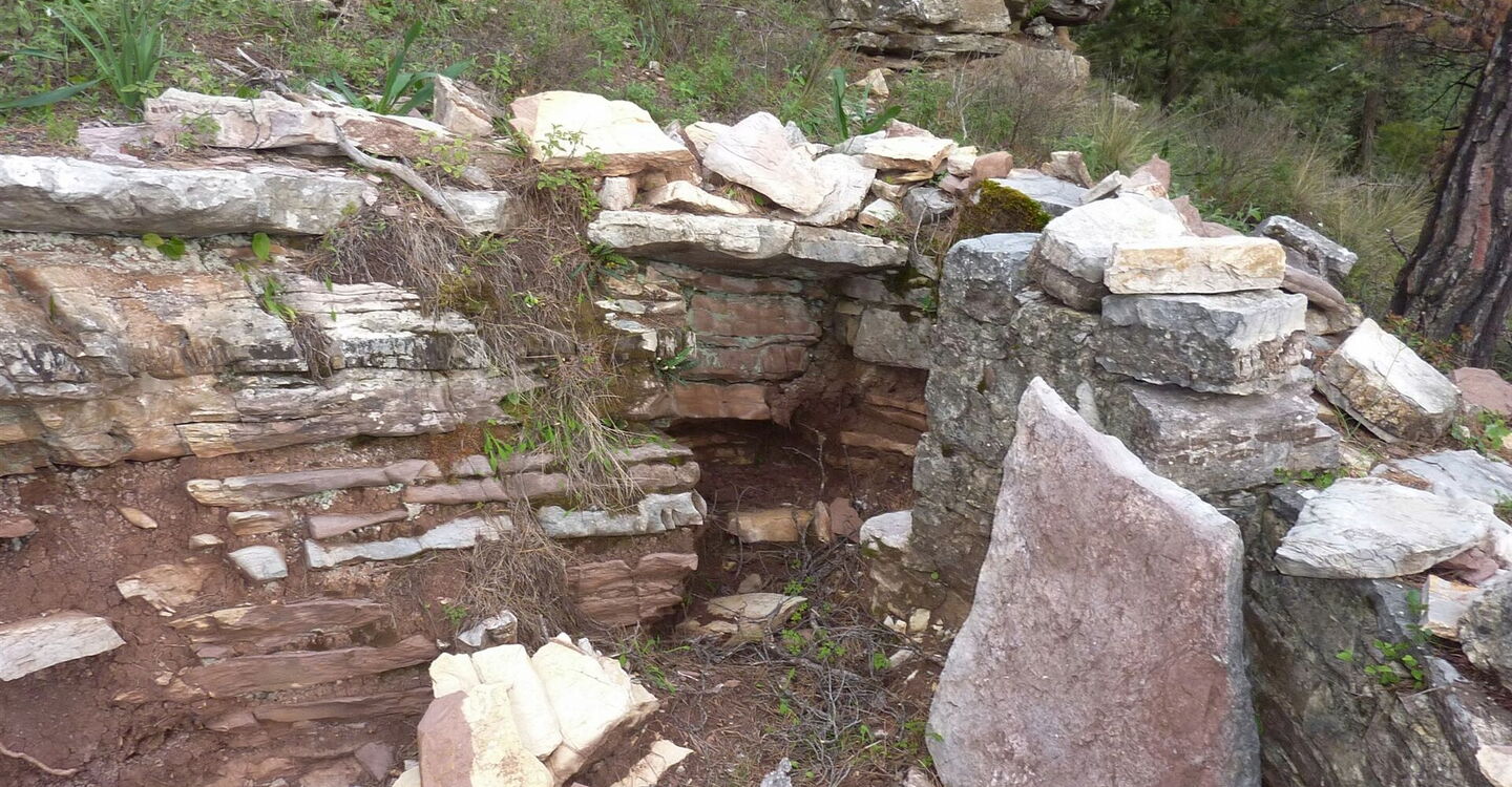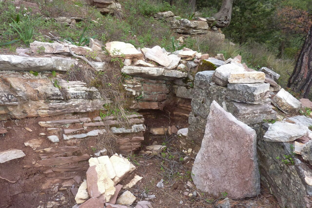 Wir treffen auf eine Schotterpiste und folgen dieser rechts, um bei der nächsten Möglichkeit – wir sehen Weinreben vor uns – abermals rechts der Schotterpiste zu folgen. Nun befinden wir uns auf der alten Verbindungsstraße von Embona nach Siana. An einer Stelle, wo diese Straße verschüttet ist, steigen wir halb links auf den beginnenden Pfad, der aber schon bald bei einem Flussbett endet – hier wurde der Pfad nach starken Niederschlägen abgetragen. Wir gehen 20 m talwärts durch das Flussbett, um dann halb links dieses wieder zu verlassen. Wir treffen auf eine Schotterpiste, auf der wir rechts entlangwandern. Schon bald treffen wir auf die Ruinen einer (04) alten Kapelle (435 m) von 1850. Sobald der Pfad endet, gehen wir halb links und weglos in Kehren bis zur Hauptstraße vor.