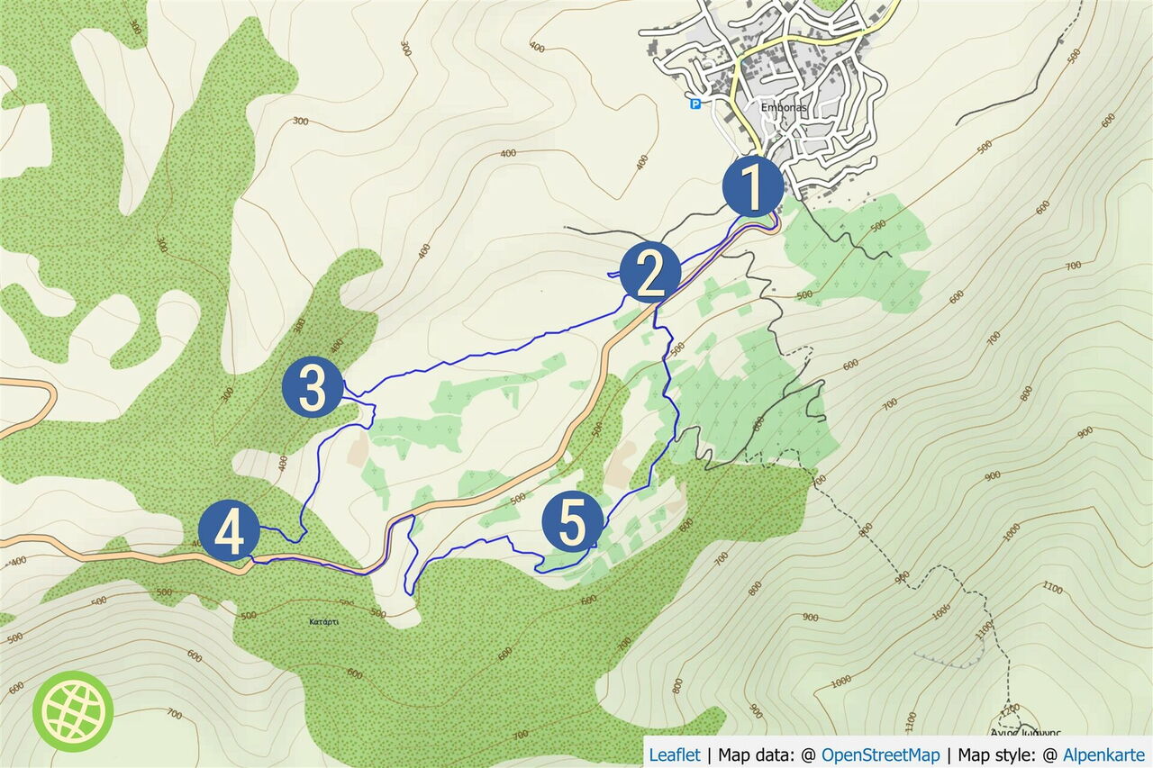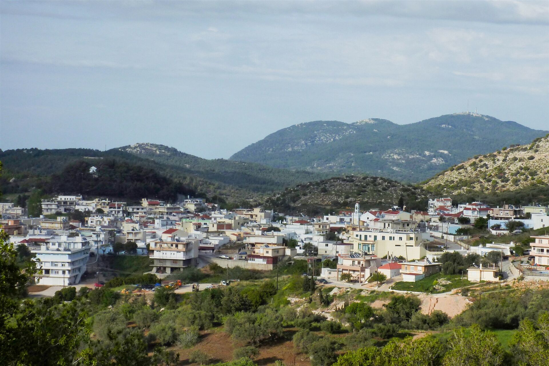 Vom (01) Start und Ziel beim Hotel Attaviros (433 m) gehen wir direkt neben dem Verkehrsspiegel halb rechts auf der betonierten Piste bergab und verlassen diese in der folgenden Rechtskurve geradeaus – dabei gehen wir rechts an einer kleinen Ruine vorbei. Mauern rechts und links des Weges begrenzen teilweise den alten Weg vom Dorf zu den Feldern. Schon bald sehen wir von unserer Position auf dem leicht ansteigenden Pfad links oberhalb einen Souvenirladen. Wir treffen bei einem Hundezwinger auf eine Schotterpiste, der wir scharf links folgen, um nach 120 m rechts auf dem ansteigenden Bergrücken weitere 70 m über eine Freifläche aufzusteigen. Drehen wir uns um, so ergeben sich traumhafte Blicke über das Dorf Embona, den dahinter liegenden Berg Profitis Ilias – zu erkennen an den Funkmasten – und halb rechts von uns auf den höchsten Berg der Insel, den 1216 m hohen Attaviros.