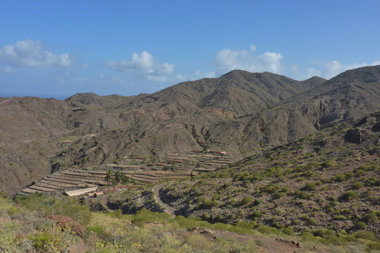 Wenn der Wanderweg endet, gehen wir rechts und folgen fortan der weiß-roten Markierung auf dem vor uns liegenden (05) Höhenwanderweg (592 m). Der Weg wird zunehmend schmaler und in einer Rechtskurve folgen wir dem rechten Abzweiger bergab. Wir laufen durch eine Region, in der der Saft der vielen Dattelpalmen gewonnen und zu Palmsirup verarbeitet wird. Schlussendlich erreichen wir die Ortschaft Epina und gehen auf einem linken Abzweiger den Treppenweg Richtung Alojera. Wir sehen nun das rote Haus, wo wir unser Auto geparkt haben, oder wir gehen links am roten Haus vorbei, um zur Bushaltestelle zu gelangen.