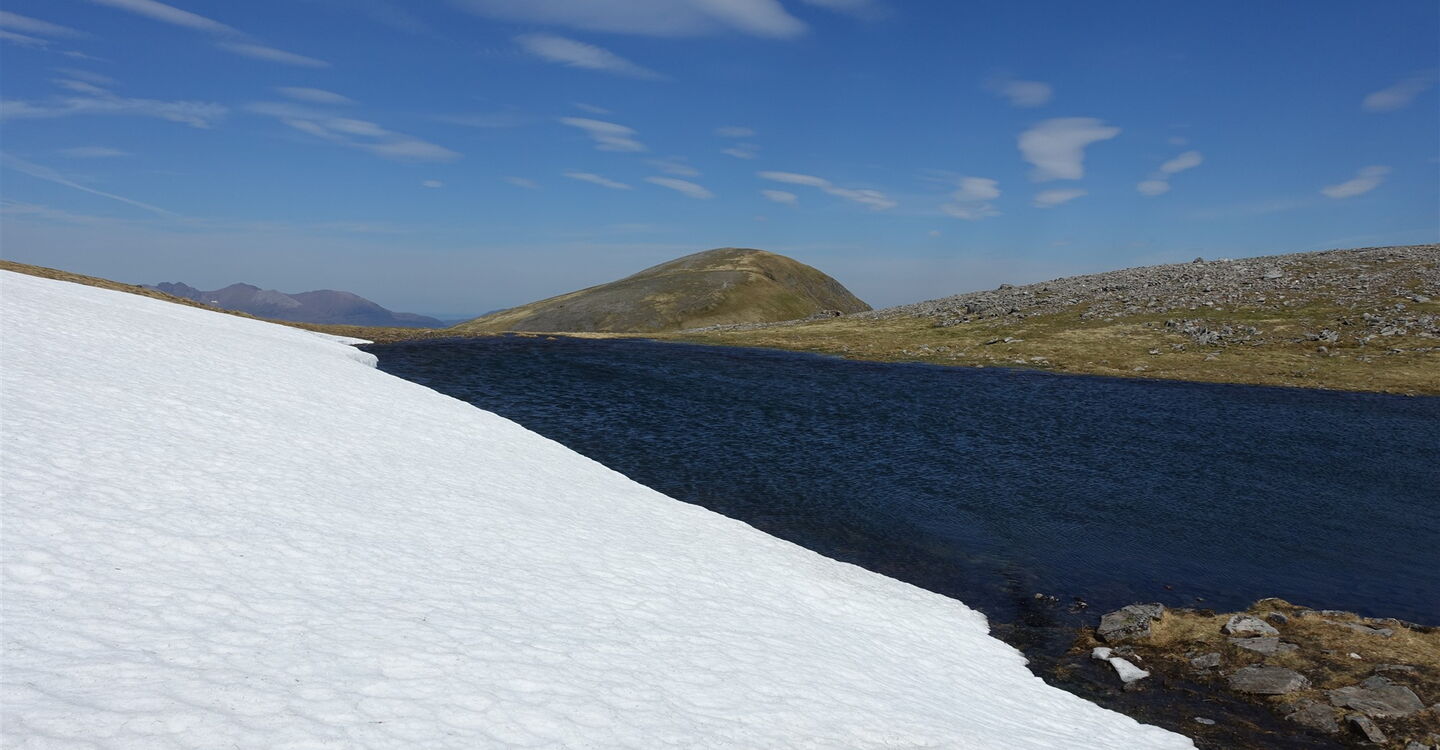 Zwischen diesem See und einem riesigen Stein – wurde wohl an dieser Stelle bei der letzten Eiszeit vergessen – queren wir die Hochebene und folgen im weiteren Verlauf dem weithin sichtbaren Pfad auf den nächsten Gipfel, den 05 Meall a‘ Chrasgaidh (934 m). Über seinen lang gezogenen nordöstlich ausgerichteten Bergrücken beginnen wir mit dem weglosen Abstieg. Sobald dieser Bergrücken an einer felsigen Stelle anfängt in südwestliche Richtung abzufallen, orientieren wir uns mehr halb rechts in Richtung der großen Brücke am See, also an unserem Aufstieg. Sobald wir im Tal den Aufstieg durch das Hochtal ausmachen können, gehen wir unter Berücksichtigung der Geländegegebenheiten möglichst direkt auf diesen Wegpunkt zu. Der Abstieg über die Moor- und Heidelandschaft ist kräfteraubend und bei Nebel eine echte Herausforderung. Sobald wir den Pfad vom Hinweg erreicht haben, gehen wir auf dem bekannten Hinweg zurück.