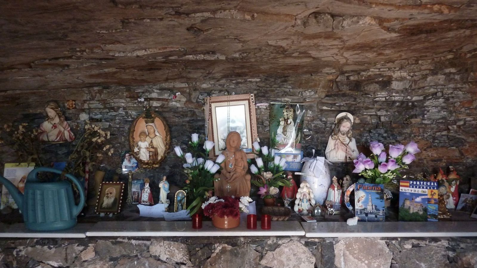 Dazu folgen wir der (02) Schotterpiste (404 m), die sich gemächlich bergauf schlängelt. Bei einem senkrecht stehenden Metallpfeiler endet die Piste und wir gehen auf dem links beginnenden Pfad auf einem Bergrücken, bis wir auf den ursprünglichen Hauptweg treffen. Diesem folgen wir rechts weiter bis zur Wallfahrtskirche, der Ermita de la Virgen de El Tanquito. Anfang des 20. Jahrhunderts wurde an dieser Stelle eine Quelle zur Wassergewinnung freigelegt. Als einige Bewohner des Ortes am Berg die Figur der Jungfrau de El Tanquito sahen, entstand die heutige Wallfahrtskirche. Nach der kleinen Erkundung geht es weiter auf dem Pfad, wir öffnen und schließen ein zweites, südlich gelegenes Ziegengatter.