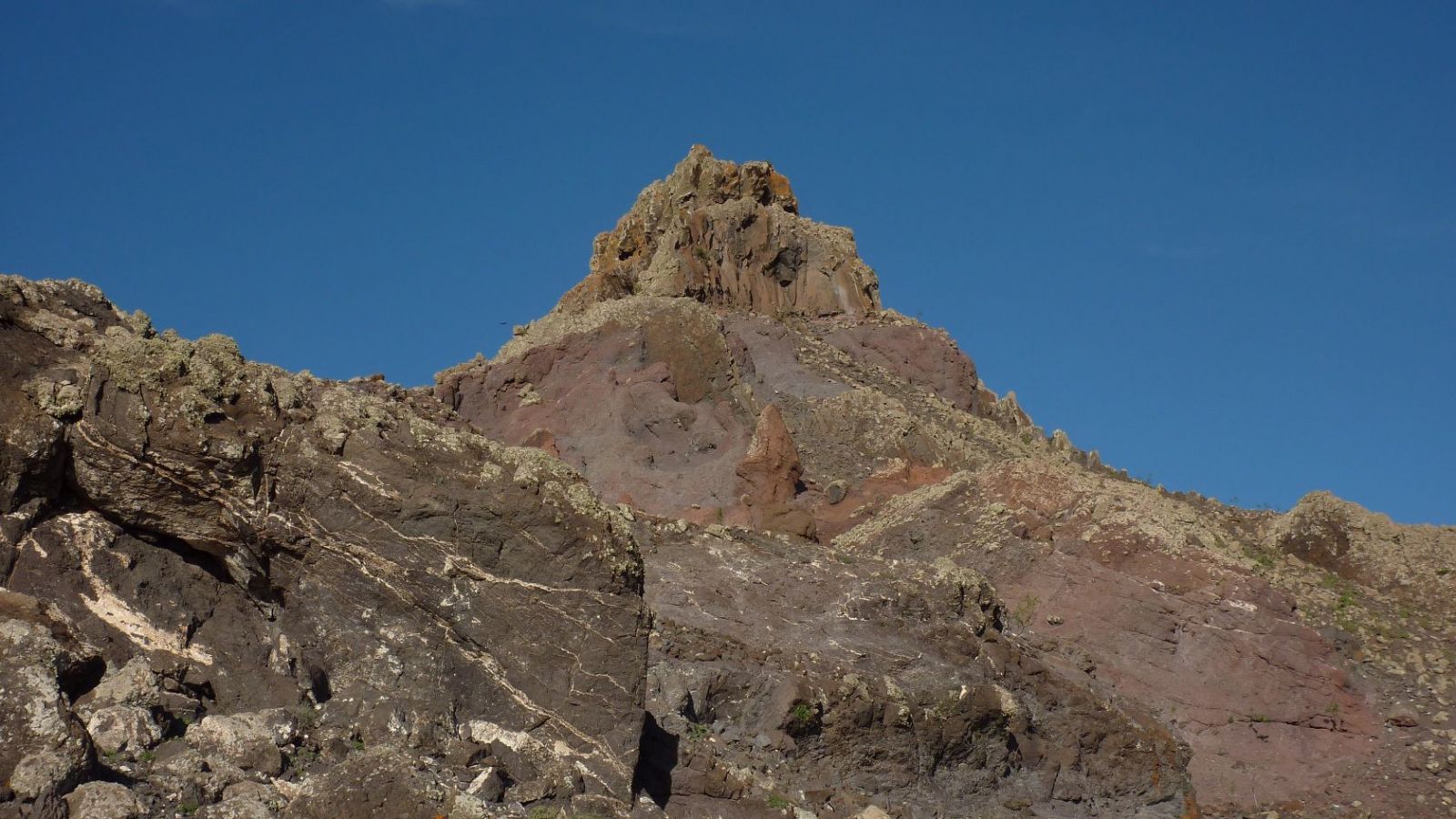 Im weiteren Verlauf steigen wir in das vor uns liegende Barranco herunter, um auf der gegenüberliegenden Seite den (03) Aufstieg (443 m) zu beginnen. Von nun an geht es weglos über zwei Felsstufen in Richtung des oberhalb stehenden markanten Felsens. An der folgenden dritten Felsstufe queren wir nach rechts, bis wir auf eine Lavamauer treffen, die wir als Aufstiegshilfe nutzen. Bald stehen wir links unterhalb des markanten Felsens. Bei der Einsattelung gehen wir noch wenige Meter bergab, vorbei an Steinmännchen, um uns dann im weiteren Verlauf immer unterhalb der längs verlaufenden Lavamauern und Felsen in Richtung Gipfel zu bewegen. Schlussendlich stehen wir vor einer 7 m hohen, scheinbar unüberwindbaren Felsmauer.