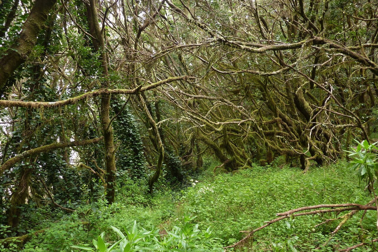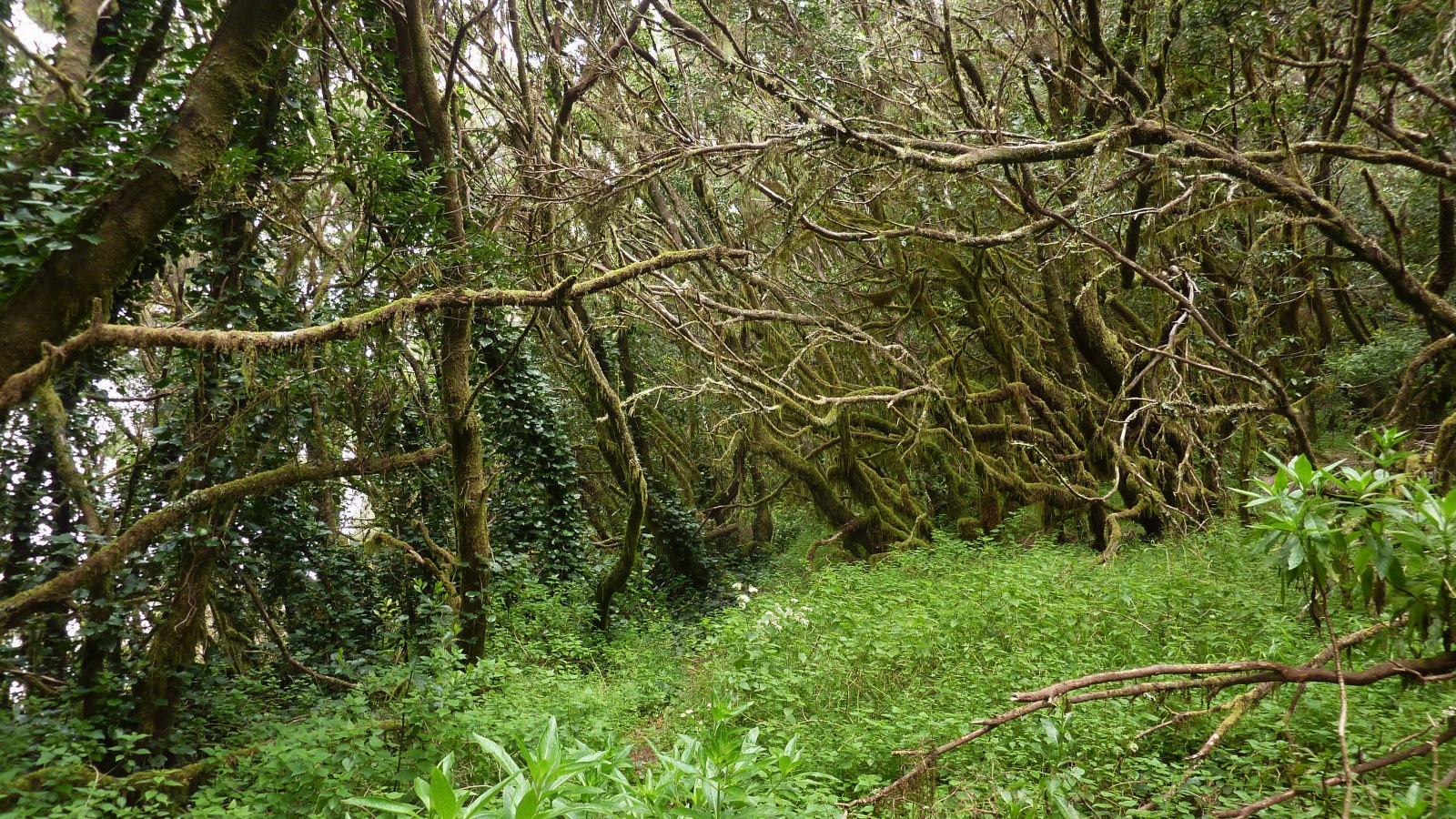 Aufgrund der windgeschützten Lage, und dass es keine Waldbrände in der jüngeren Vergangenheit gab, führt die Wanderung auf diesem Abschnitt durch den ältesten Baumbestand auf La Gomera. Nach 380 m vernimmt man das Plätschern eines Baches, und dann plötzlich taucht er aus dem Dickicht der Bäume auf, ein riesiger, 7 × 12 m großer (04) Fels (803 m). Geht man rechts oder links am Felsen vorbei, befinden sich dort noch weitere Felsen, aber nicht zu mächtig wie der am Wegesrand.